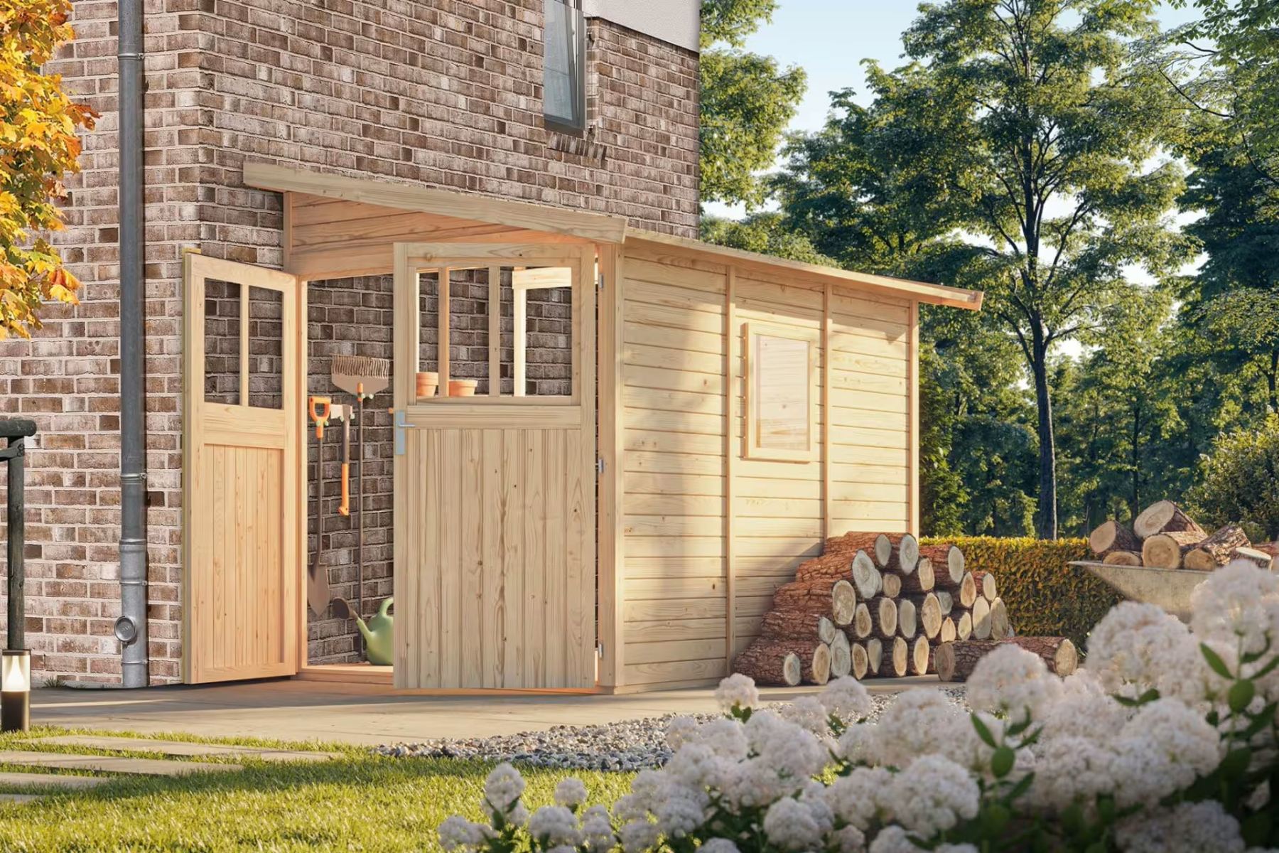 Domek drewniany z możliwością montażu do ściany. W drewnianym domu można przechowywać sprzęt ogrodowy, narzędzia lub zbudować w nim warsztat majsterkowania. Dom ma dwuspadowy dach i jedne dwuskrzydłowe drzwi na zawiasach z oknem w każdym skrzydle. Materiałem konstrukcyjnym domu są profile drewniane o grubości 19 mm, doskonale wyfrezowane ze świerku nordyckiego. Dostarczamy go w zestawie w stanie rozłożonym, gdzie ściany składają się z pojedynczych profili drewnianych, które wystarczy złożyć i skręcić, dach składa się z jednej deski. Gwarantuje to niezwykle prosty montaż, z którym poradzi sobie każdy czeski majsterkowicz.