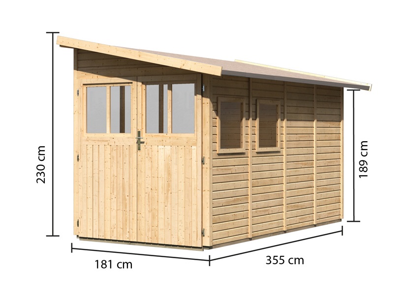 Dom drewniany do ściany, grubość ściany 19 mm, wymiary sz 181 x gł 355 cm, powierzchnia zewnętrzna domu 6,40 m2.
