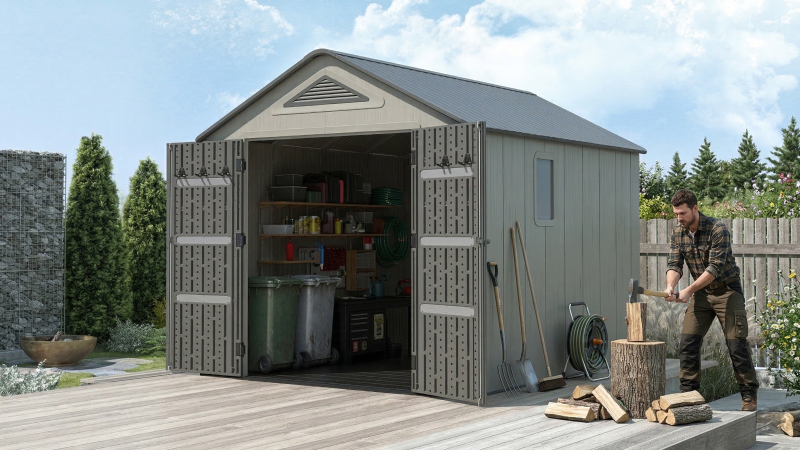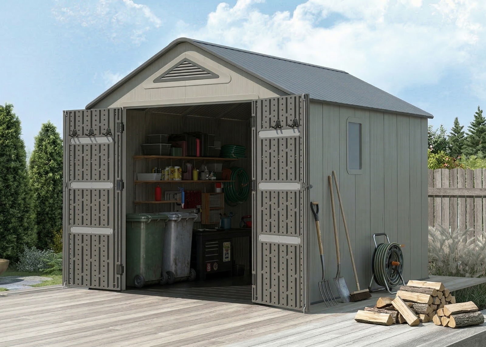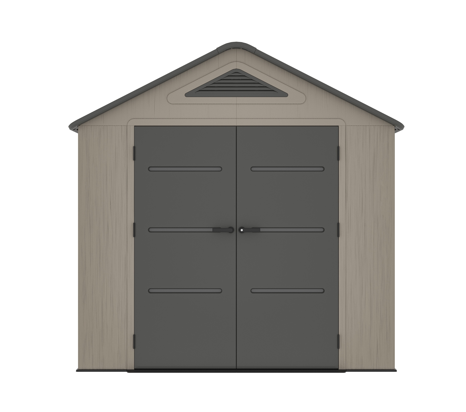 Wytrzymały, plastikowy domek „nowej generacji” do przechowywania sprzętu ogrodniczego, sportowego, basenowego, grillowego, kempingowego, samochodowego i innych rzeczy. Nowoczesny design, łatwy montaż, całoroczne użytkowanie. Domek ogrodowy ma metalową konstrukcję nośną, a podwójne ściany, dach, podwójne drzwi i podłoga wykonane są z solidnego, bardzo wytrzymałego i praktycznie niezniszczalnego tworzywa sztucznego (polietylen o wysokiej wytrzymałości z filtrem UV). Plastikowa podłoga antypoślizgowa jest częścią domku (wliczona w cenę). Domek wyposażony jest w podwójne drzwi na zawiasach. Grubość podwójnej plastikowej ściany wynosi 22 mm, a grubość dachu 36 mm. Nachylenie dachu wynosi 30°, co znacznie zmniejsza ilość i nacisk śniegu na dach. Materiał, z którego wykonany jest domek, nie żółknie ani nie staje się kruchy, dzięki czemu nie ma potrzeby regularnego malowania domku, jak ma to miejsce np. w przypadku domków drewnianych - plastikowy domek ogrodowy jest praktycznie bezobsługowy. Domek został zaprojektowany i wykonany tak, aby montaż był jak najprostszy i najkrótszy. Wystarczy wcisnąć poszczególne elementy w sąsiednie i zabezpieczyć połączenie śrubą.