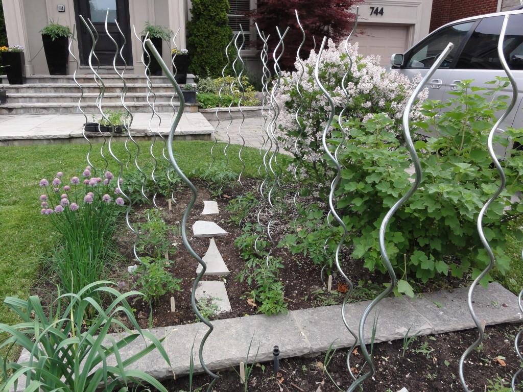 Zestaw stalowych, ocynkowanych prętów skręcanych do uprawy pomidorów.