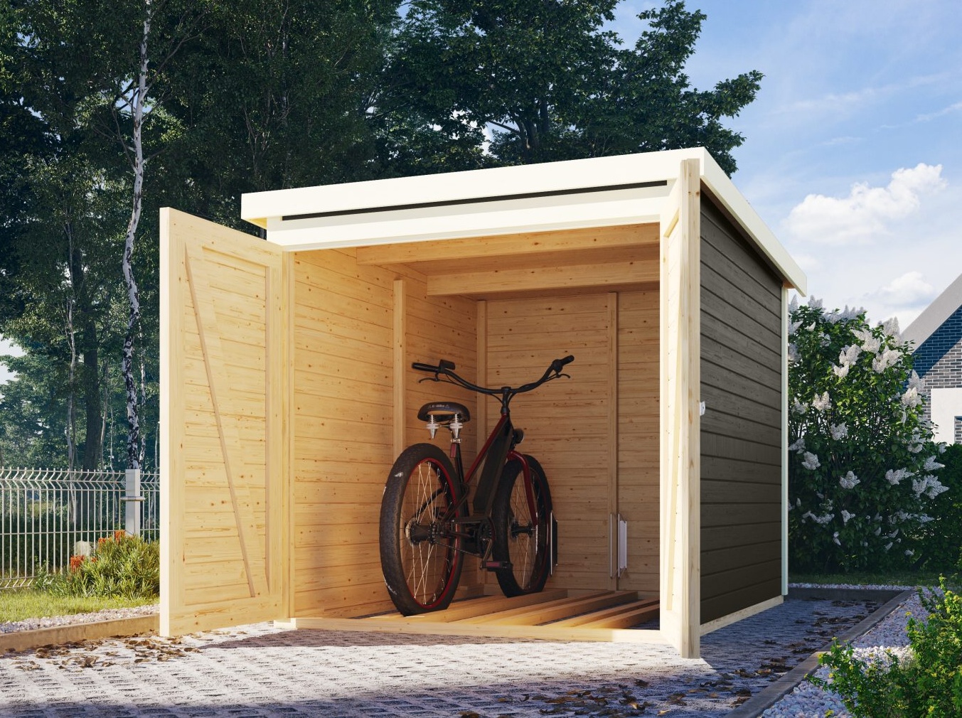 Garaż na 3 rowery. Ten model posiada dach jednospadowy oraz dwuskrzydłowe drzwi na zawiasach. Materiałem konstrukcyjnym garażu są drewniane profile o grubości 19 mm, idealnie wyfrezowane ze świerku nordyckiego. Dostarczamy zestaw w stanie zdemontowanym, gdzie ściany wykonane są z pojedynczych profili drewnianych, które wystarczy zmontować i skręcić ze sobą, a dach to lita deska. Gwarantuje to niezwykle prosty montaż, z którym poradzi sobie każdy czeski majsterkowicz. Garaż rowerowy zawiera również półki i uchwyty na opony rowerowe.