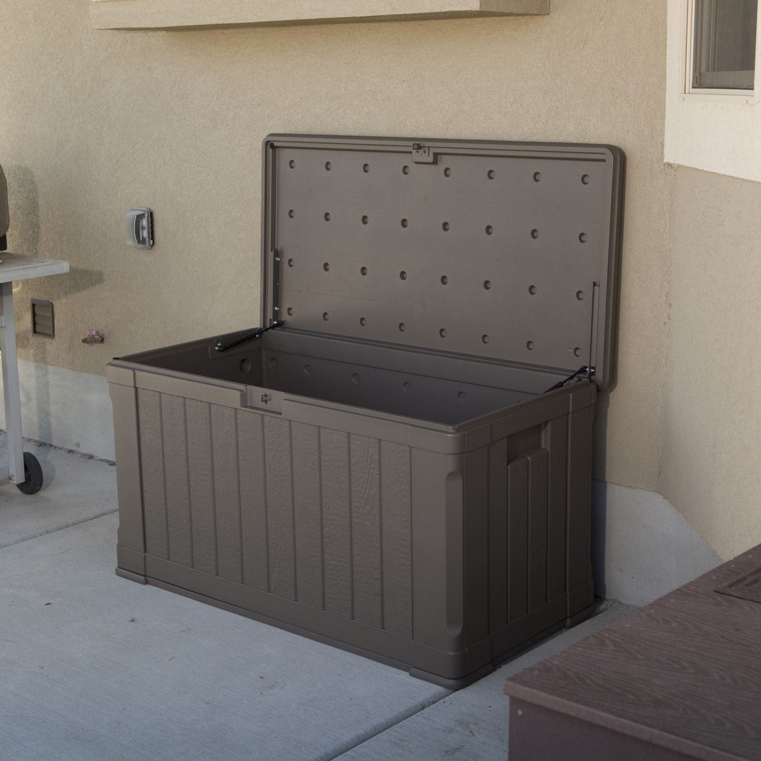 Skrzynka ogrodowa LIFETIME ma podwójną ściankę wykonaną z odpornego na promieniowanie UV tworzywa sztucznego (polietylenu) o grubości 26 mm, jest całkowicie wodoodporna i nie wymaga pielęgnacji. Posiada wygodną pokrywę zabezpieczoną dwoma pneumatycznymi tłokami z amortyzatorem (podobnie jak tłoczki na przedniej masce droższych samochodów). Mechanizm tłokowy ochroni również Twoje dzieci, ponieważ pokrywa nie spadnie im nagle z rąk. Niezwykle wysokiej jakości tworzywo sztuczne uratuje Cię od częstego malowania, podobnie jak w przypadku innych drewnianych lub metalowych mebli ogrodowych.