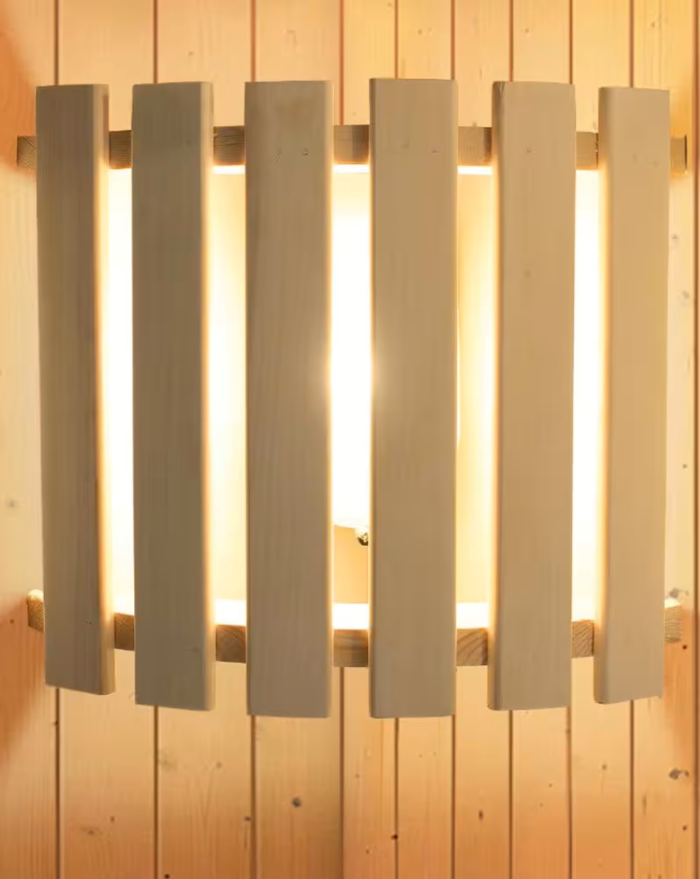 Nowoczesna oświetlenie do sauny wykonana z litego drewna z listwami rozpraszającymi tworzy przytulną i relaksującą atmosferę w saunie.