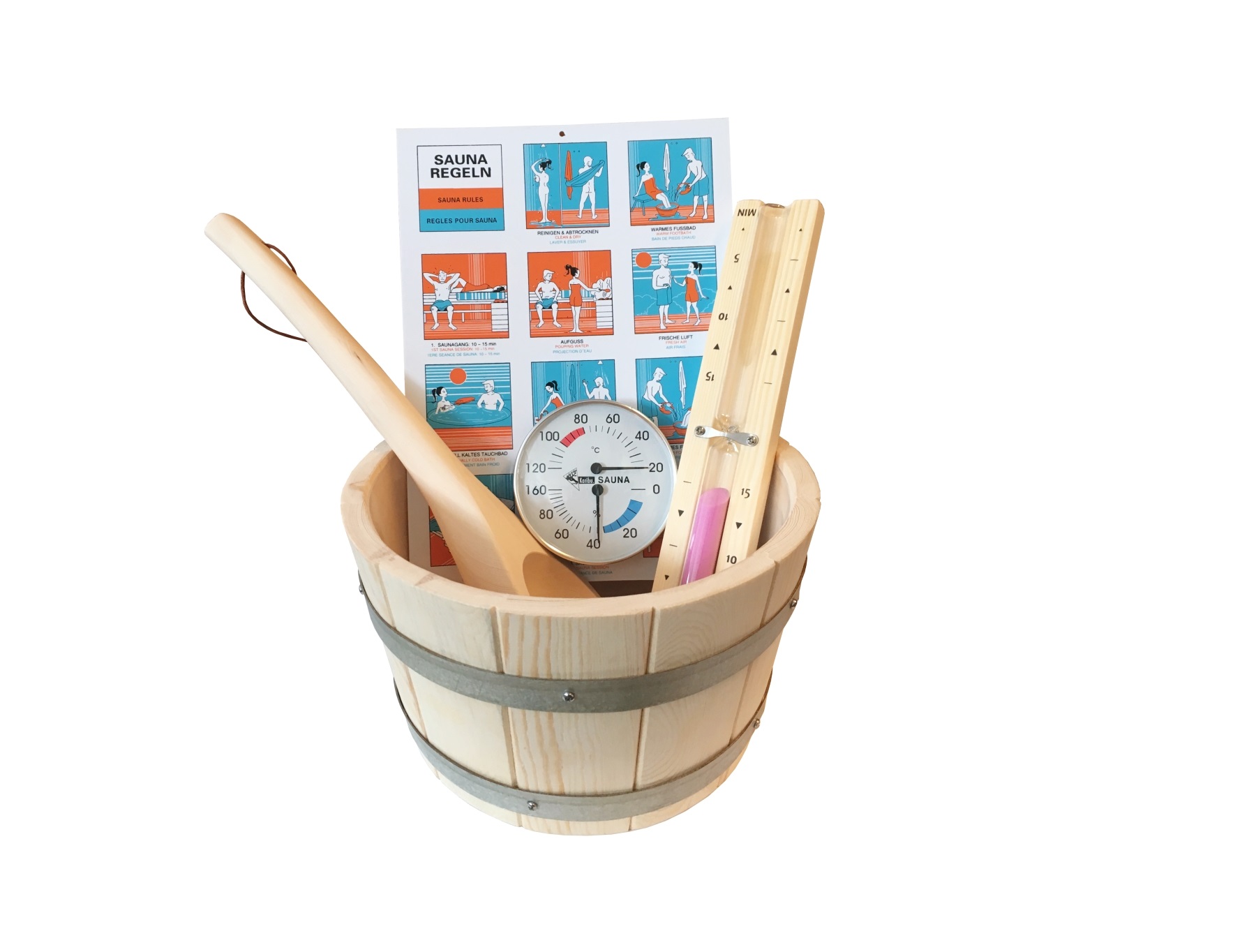 Nasza wskazówka dotycząca doskonałych wrażeń w saunie. Pakiet sauny zawiera wszystkie podstawowe akcesoria potrzebne do idealnej sauny. Aby temperatura była zawsze pod kontrolą, w zestawie znajduje się termometr i higrometr. Ma średnicę 10 cm, metalową obudowę i chromowaną ramkę. Klepsydra wskazuje czas sauny (15 minut) i w ten sposób nadaje impuls fazie schładzania. W zestawie znajduje się również świerkowe wiadro na wodę z plastikowym wkładem i drewnianą łyżką.