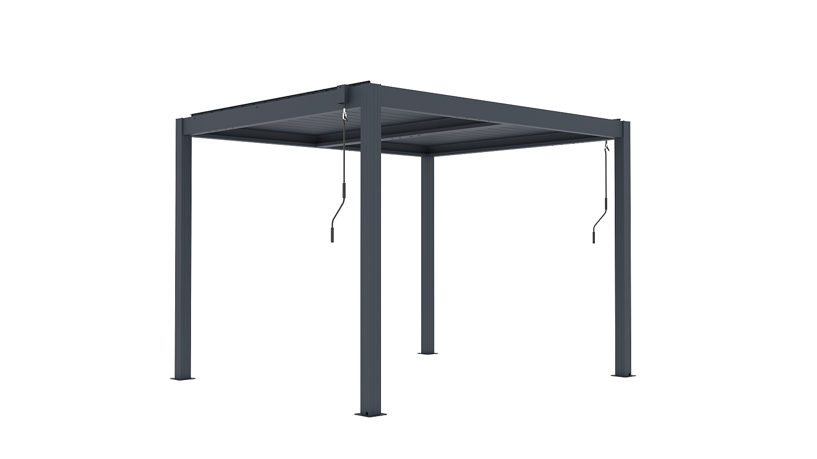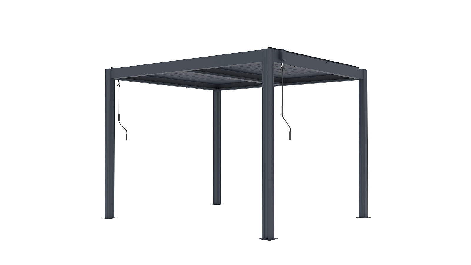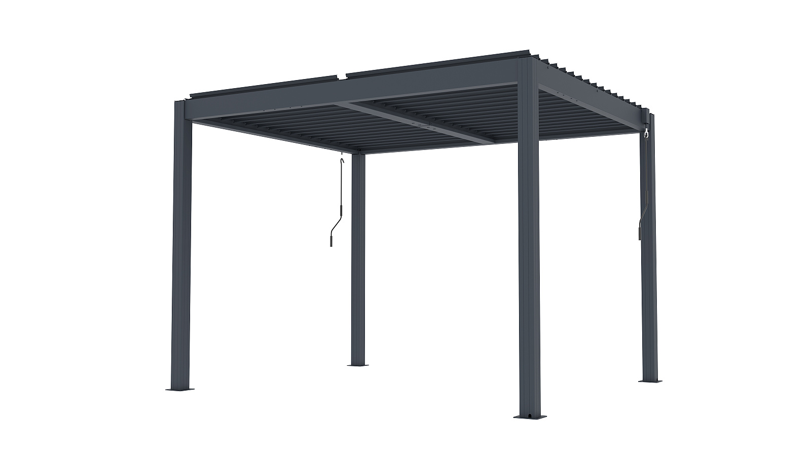 Podstawowa wersja pergoli aluminiowej BIOCLIMATIC o wymiarach sz 3,04 x gł 2,59 x w 2,20 m, kolor antracyt, płaski dach lamelowy obsługiwany ręcznie.