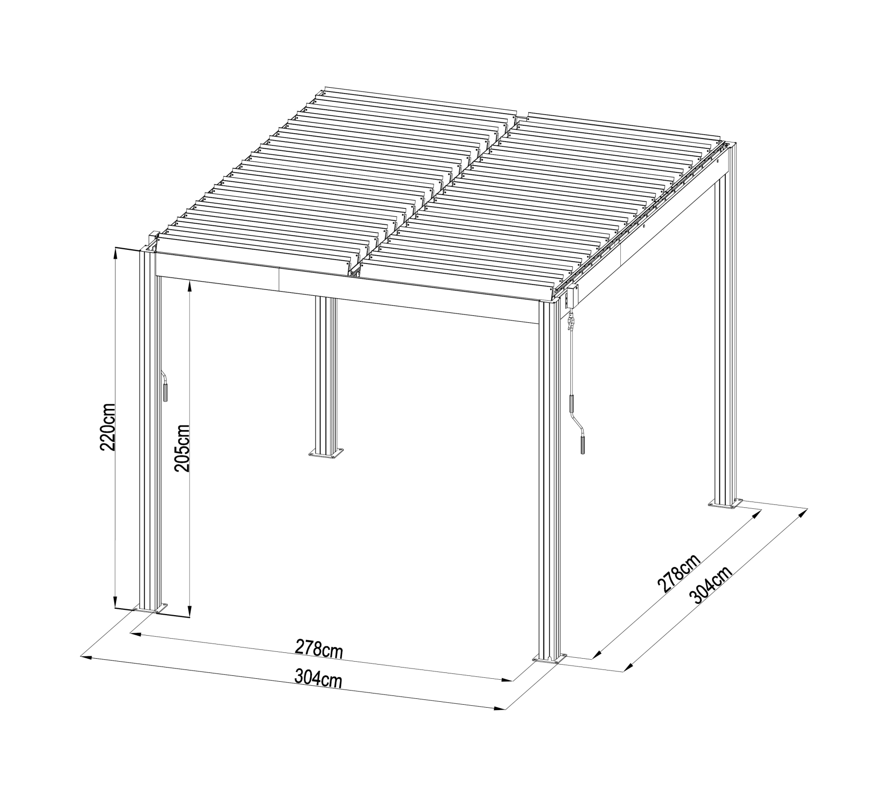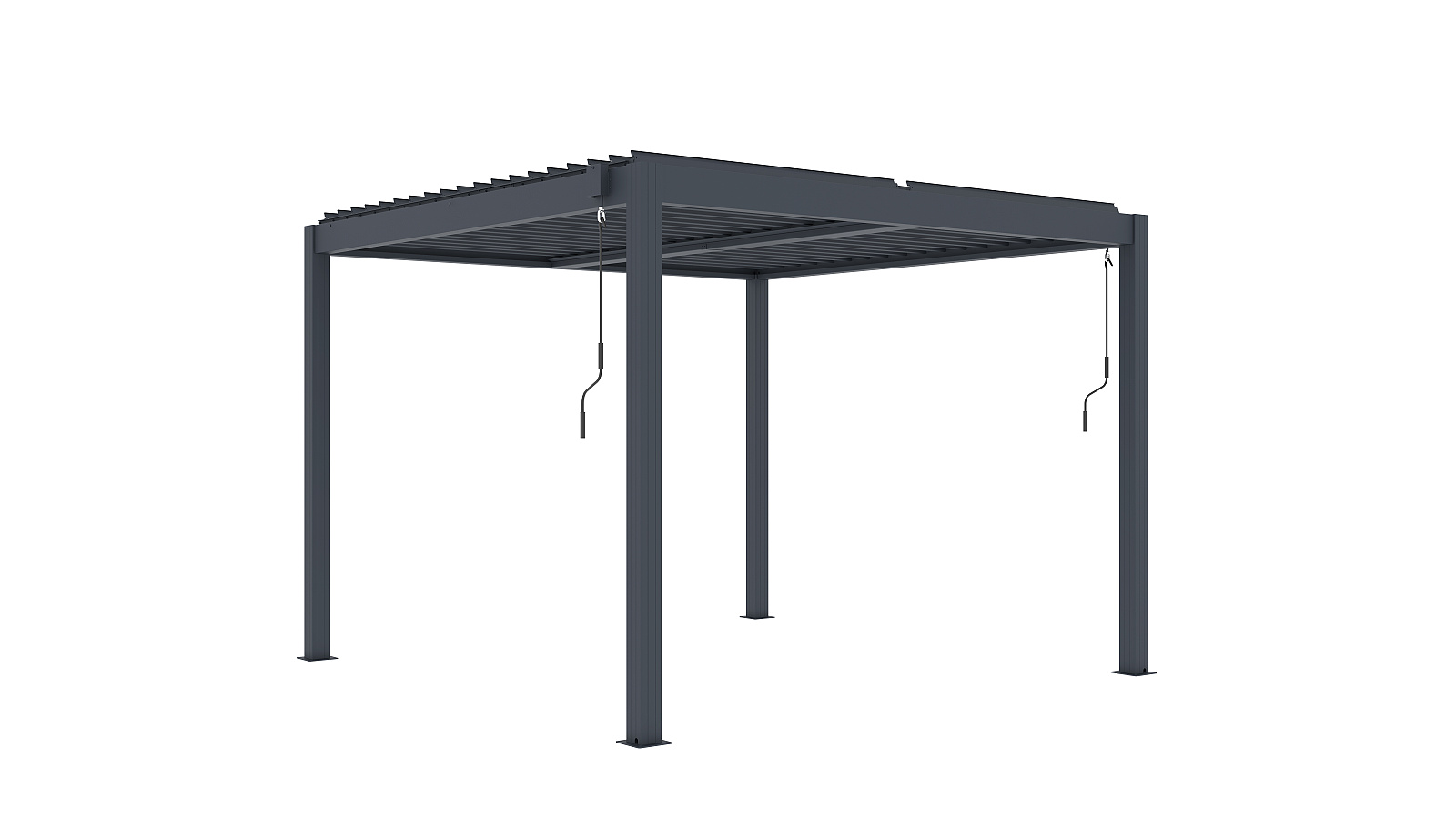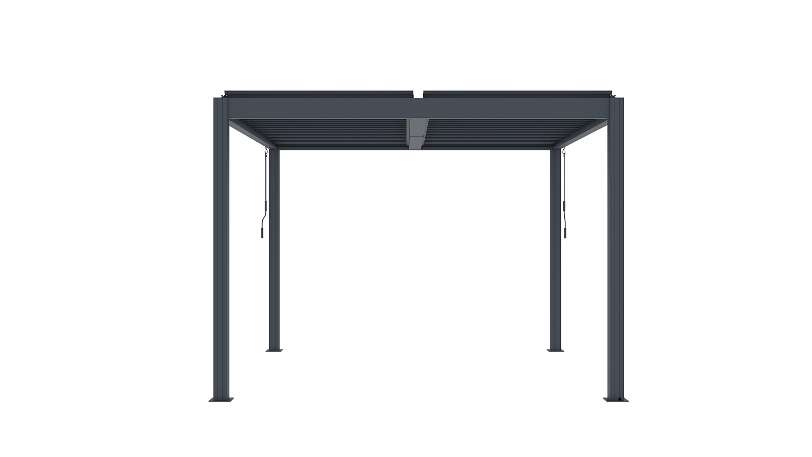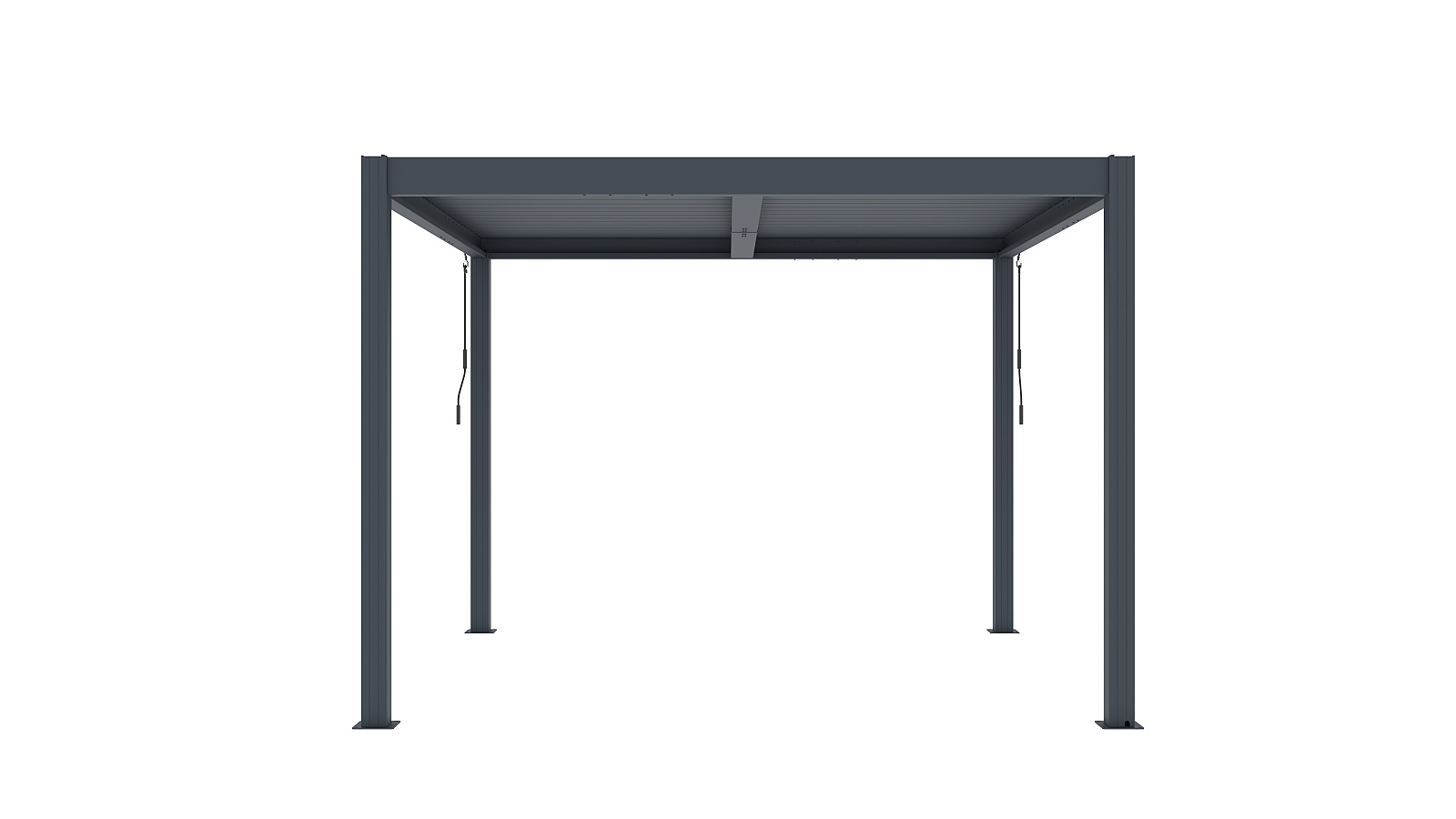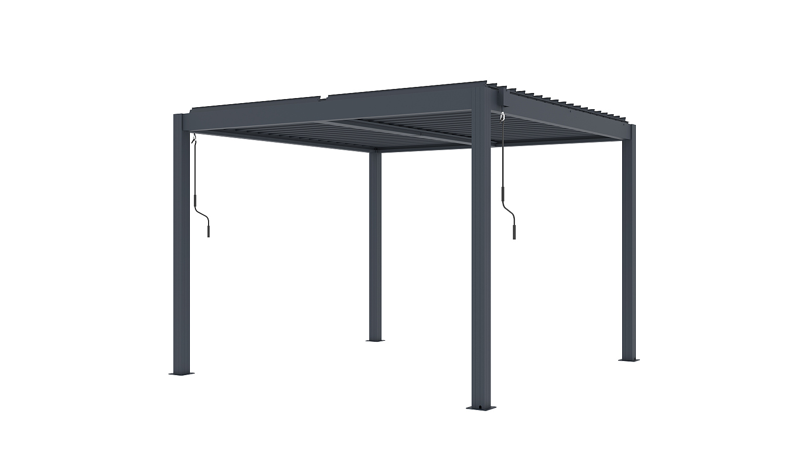 Podstawowa wersja pergoli aluminiowej BIOCLIMATIC o sz 3,04 x gł 3,04 x w 2,20 m, kolor antracyt, płaski dach lamelowy obsługiwany ręcznie.
