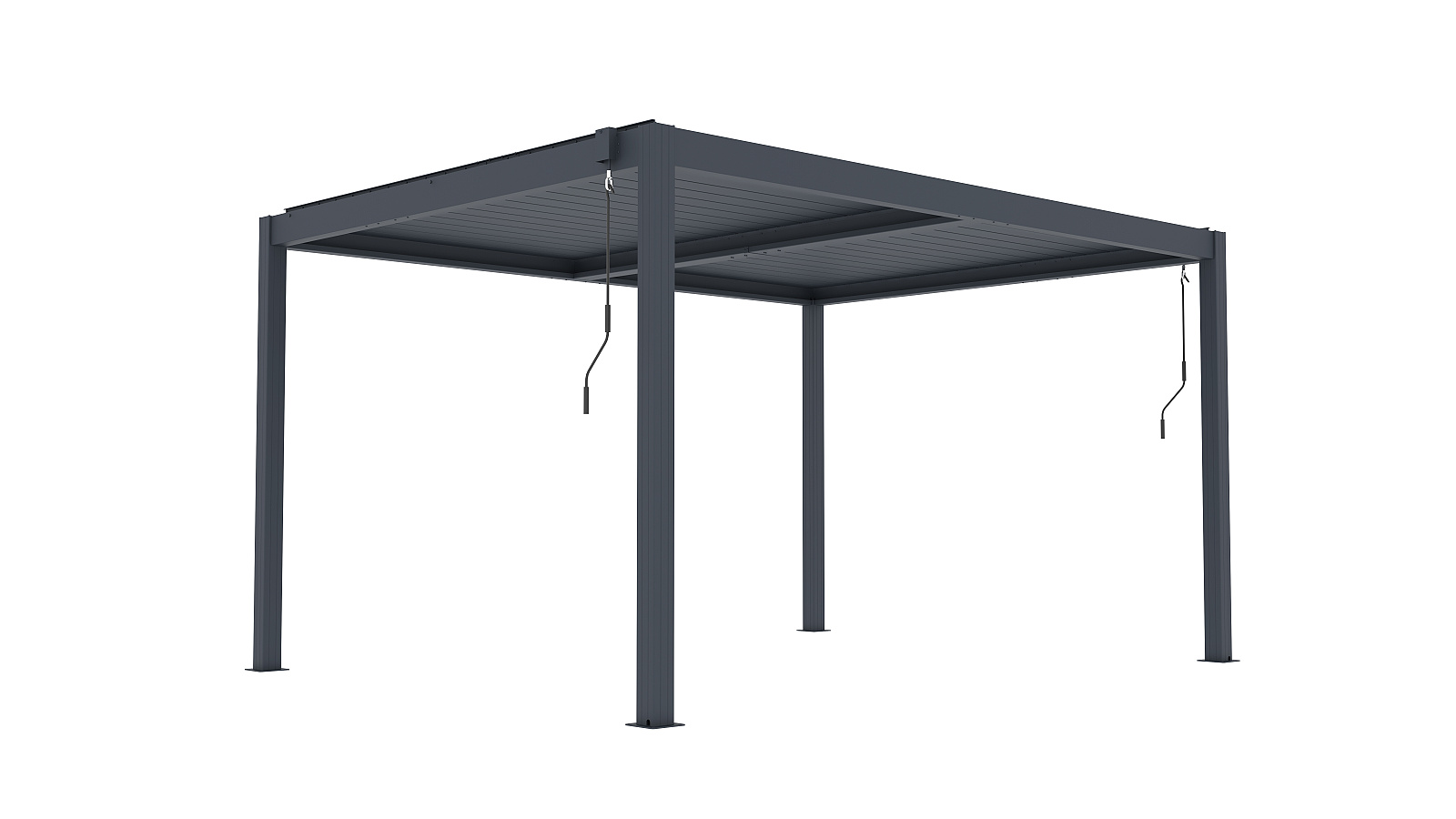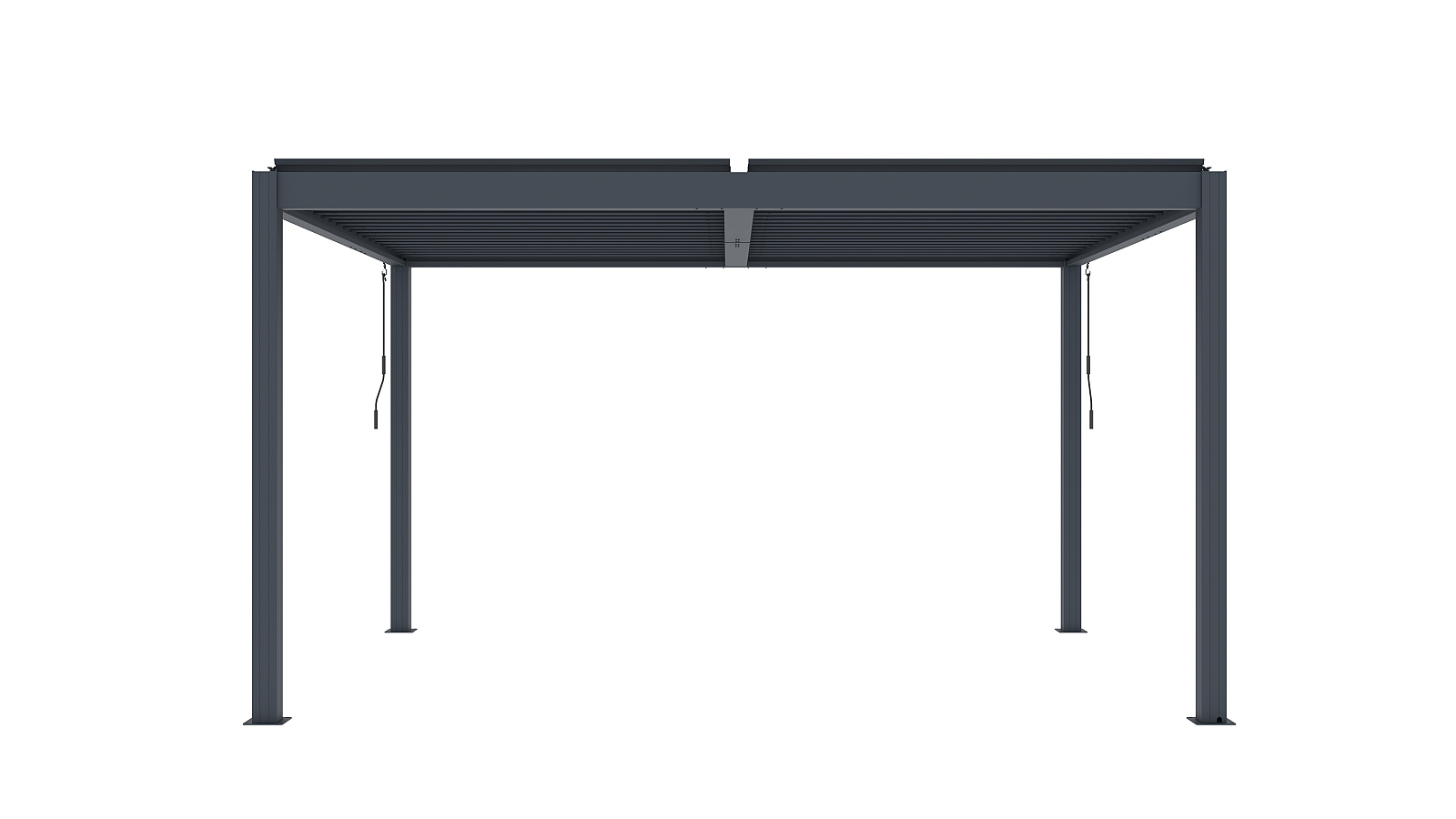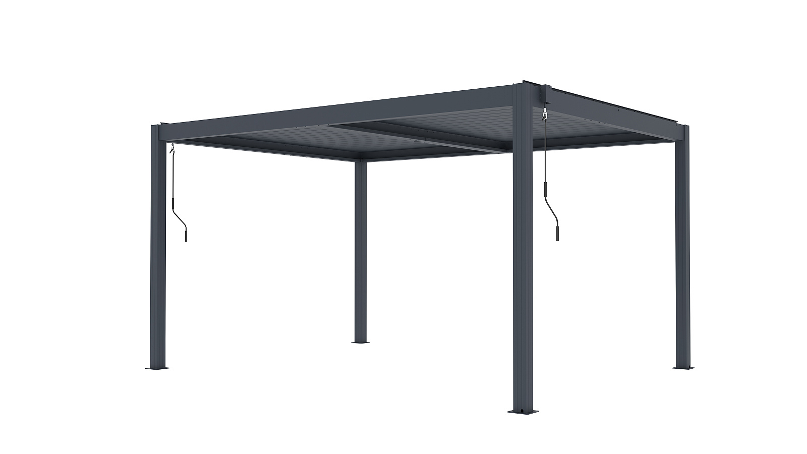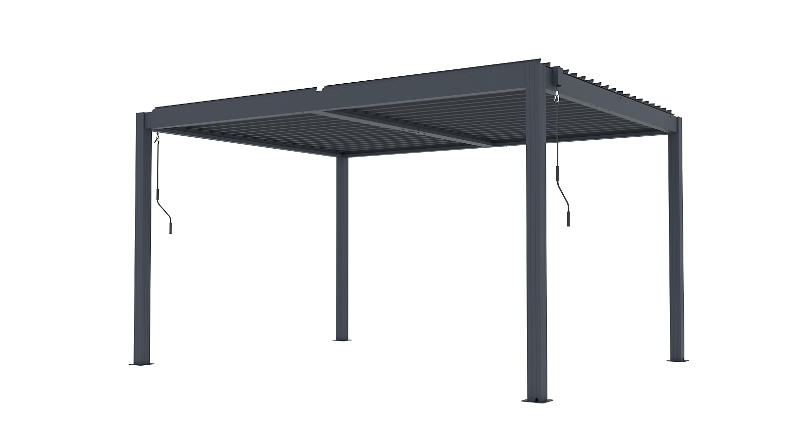 Podstawowa wersja pergoli aluminiowej BIOCLIMATIC o sz 3,95 x gł 3,05 x w 2,20 m, kolor antracyt, płaski dach lamelowy obsługiwany ręcznie.