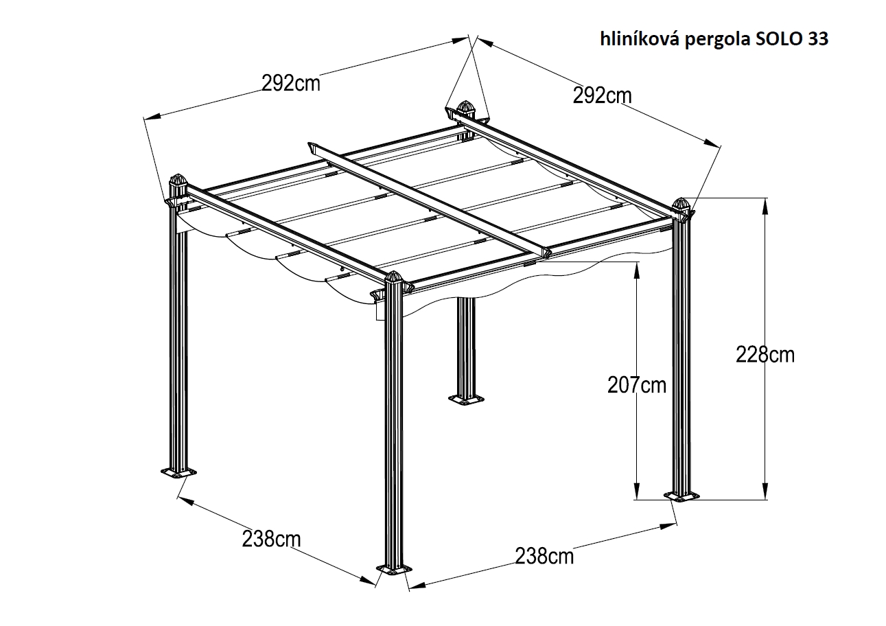 Pergola aluminiowa, szer 2,92 x gł 2,92 x wys 2,28 m, kolor antracyt, rozsuwany dach brezentowy, powierzchnia 8,53 m2.