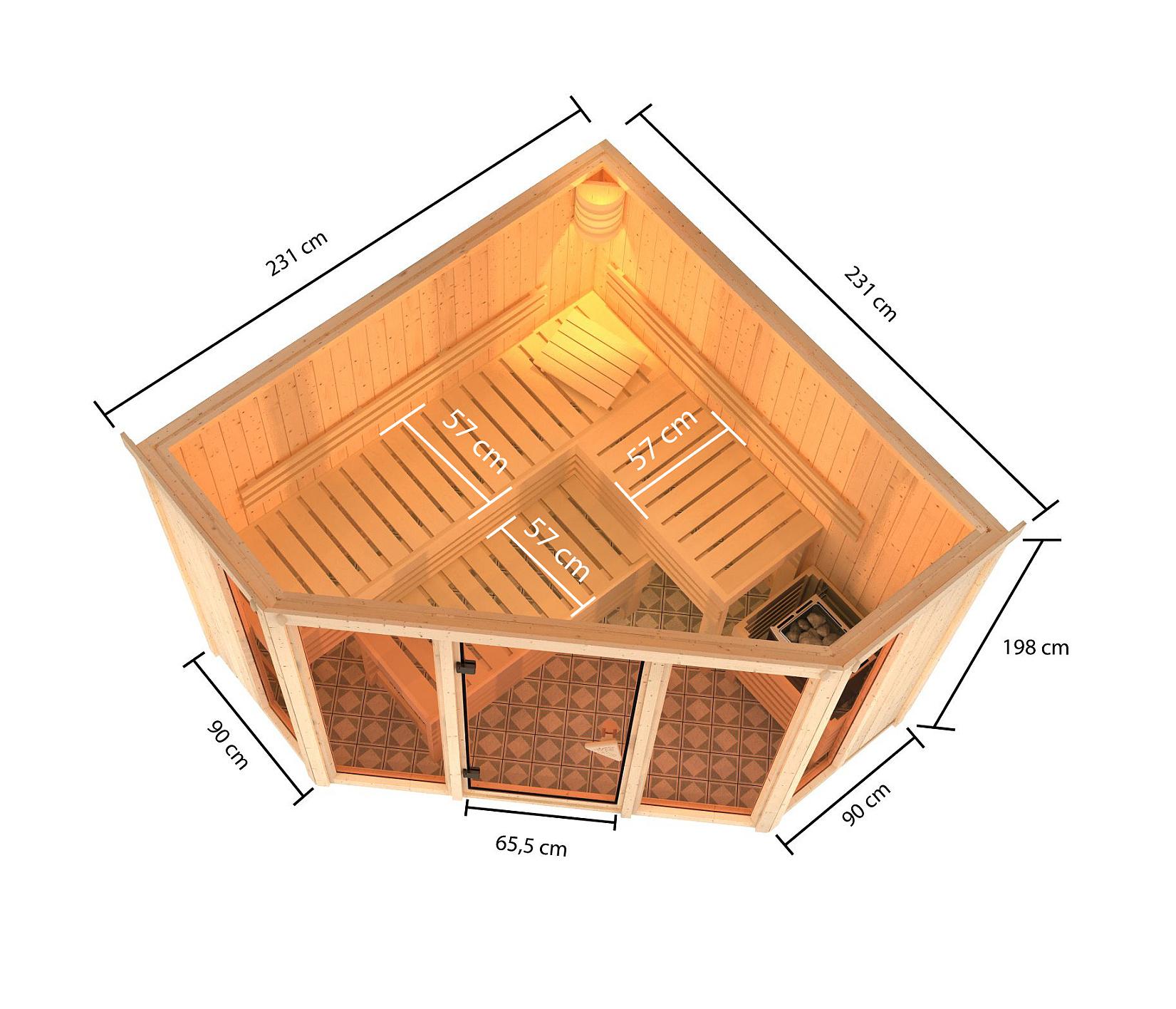 Sauna fińska przeznaczona dla trzech osób w pozycji leżącej. Wymiary: sz 231 cm, gł 231 cm, w 198 cm, z narożnymi drzwiami. Ten model sauny fińskiej posiada 4 stałe okna. Sauna jest przeznaczona do ogrzewanych wnętrz domu lub mieszkania. Jej producent, firma KARIBU HOLZTECHNIK z niemieckiego Bremy, z powodzeniem nawiązała swoimi produktami do wielowiekowej tradycji skandynawskiego saunowania, jednocześnie wprowadzając do niej nowoczesne technologie. Sauna jest w całości wykonana z drewna świerku skandynawskiego w naturalnym wykończeniu. Drewno pochodzi z odległej północy Europy i jest całkowicie nieprzetworzone chemicznie (nie jest ani impregnowane, ani lakierowane). W efekcie jest wolne od wszelkich znanych substancji problematycznych, które mogłyby uwalniać się z drewna podczas saunowania. Ta wewnętrzna sauna cechuje się wyjątkowymi właściwościami termoizolacyjnymi. Ściany sauny składają się z wewnętrznej i zewnętrznej warstwy specjalnie wygładzonych desek z piórem i wpustem, pomiędzy którymi znajduje się 42-milimetrowa izolacja termiczna z wełny mineralnej. Całkowita grubość ściany wynosi zatem 68 mm. Tylnia, niewidoczna strona sauny, przylegająca do ściany pomieszczenia, jest pokryta powierzchnią z płyty pilśniowej.