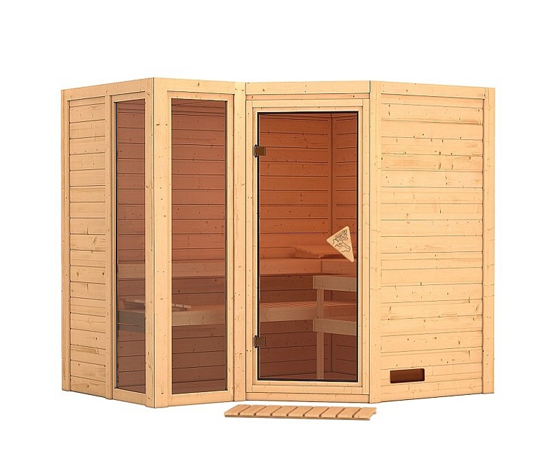 Finská sauna przeznaczona dla trzech osób w pozycji leżącej. Wymiary: sz 236 cm, gł 184 cm, w 209 cm. Ten model sauny fińskiej jest przeznaczony do ogrzewanych wnętrz domu lub mieszkania. Jej producent, firma KARIBU HOLZTECHNIK z niemieckiego Bremy, z powodzeniem nawiązała swoimi produktami do wielowiekowej tradycji skandynawskiego saunowania, jednocześnie wprowadzając do niej nowoczesne technologie. Sauna jest w całości wykonana z drewna świerku skandynawskiego w naturalnym wykończeniu. Drewno pochodzi z odległej północy Europy i jest całkowicie nieprzetworzone chemicznie (nie jest ani impregnowane, ani lakierowane). W efekcie jest wolne od wszelkich znanych substancji problematycznych, które mogłyby uwalniać się z drewna podczas saunowania. Ta sauna wewnętrzna jest wykonana z litego drewna o grubości 40 mm. Ściany sauny składają się ze specjalnie wygładzonych desek z podwójnym piórem i wpustem, co gwarantuje niezwykłą wytrzymałość połączeń.