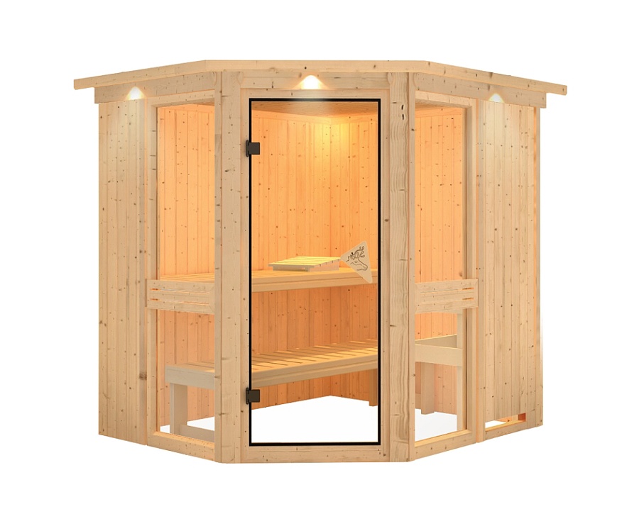 Finská sauna przeznaczona dla dwóch osób w pozycji leżącej. Wymiary: sz 210 cm, gł 184 cm, w 202 cm. Ten model sauny fińskiej jest przeznaczony do ogrzewanych wnętrz domu lub mieszkania. Listwa sufitowa z 3 wbudowanymi światłami LED doskonale tworzy atmosferę sauny. Jej producent, firma KARIBU HOLZTECHNIK z niemieckiego Bremy, z powodzeniem nawiązała swoimi produktami do wielowiekowej tradycji skandynawskiego saunowania, jednocześnie wprowadzając do niej nowoczesne technologie. Sauna jest w całości wykonana z drewna świerku skandynawskiego w naturalnym wykończeniu. Drewno pochodzi z odległej północy Europy i jest całkowicie nieprzetworzone chemicznie (nie jest ani impregnowane, ani lakierowane). W efekcie jest wolne od wszelkich znanych substancji problematycznych, które mogłyby uwalniać się z drewna podczas saunowania. Ta wewnętrzna sauna cechuje się wyjątkowymi właściwościami termoizolacyjnymi. Ściany sauny składają się z wewnętrznej i zewnętrznej warstwy specjalnie wygładzonych desek z piórem i wpustem, pomiędzy którymi znajduje się 42-milimetrowa izolacja termiczna z wełny mineralnej. Całkowita grubość ściany wynosi zatem 68 mm. Tylne lub boczne niewidoczne strony, które przylegają do ściany pomieszczenia, mają zewnętrzną warstwę z płyty pilśniowej. Dlatego przy tej samej izolacji termicznej są cieńsze o około 10 mm w porównaniu z widocznymi stronami pokrytymi boazerią.