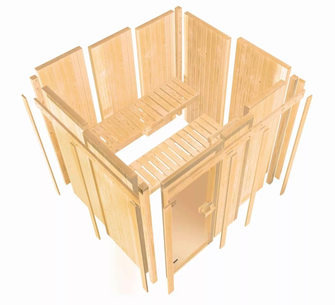 Fińska sauna przeznaczona dla trzech osób. Ma wymiary sz 216 x gł 234 x w 198 cm. Ten model sauny fińskiej jest przeznaczony do ogrzewanych wnętrz domu lub mieszkania. Jej producent, firma KARIBU HOLZTECHNIK z niemieckich Brem, z powodzeniem nawiązał swoimi produktami do wielowiekowej tradycji skandynawskiego saunowania, jednocześnie wdrażając nowoczesne technologie. Sauna jest w całości wykonana z drewna świerku skandynawskiego w naturalnym wykończeniu. Drewno pochodzi z dalekiej północy Europy i jest całkowicie niepoddane obróbce chemicznej (nie jest ani bejcowane, ani lakierowane). Dzięki temu jest wolne od wszystkich znanych szkodliwych substancji, które mogłyby uwalniać się z drewna podczas saunowania.Ta sauna wewnętrzna charakteryzuje się wyjątkowymi właściwościami termoizolacyjnymi. Ściany sauny składają się z wewnętrznej i zewnętrznej warstwy specjalnie wygładzonych desek z piórem i wpustem, pomiędzy którymi znajduje się 42-milimetrowa izolacja termiczna z wełny mineralnej. Całkowita grubość ściany wynosi zatem 68 mm. Tylne lub boczne niewidoczne strony, skierowane ku ścianie pomieszczenia, mają zewnętrzną stronę wykonaną z płyty pilśniowej. Dlatego przy tej samej izolacji termicznej są o około 10 mm cieńsze niż widoczne strony pokryte boazerią.