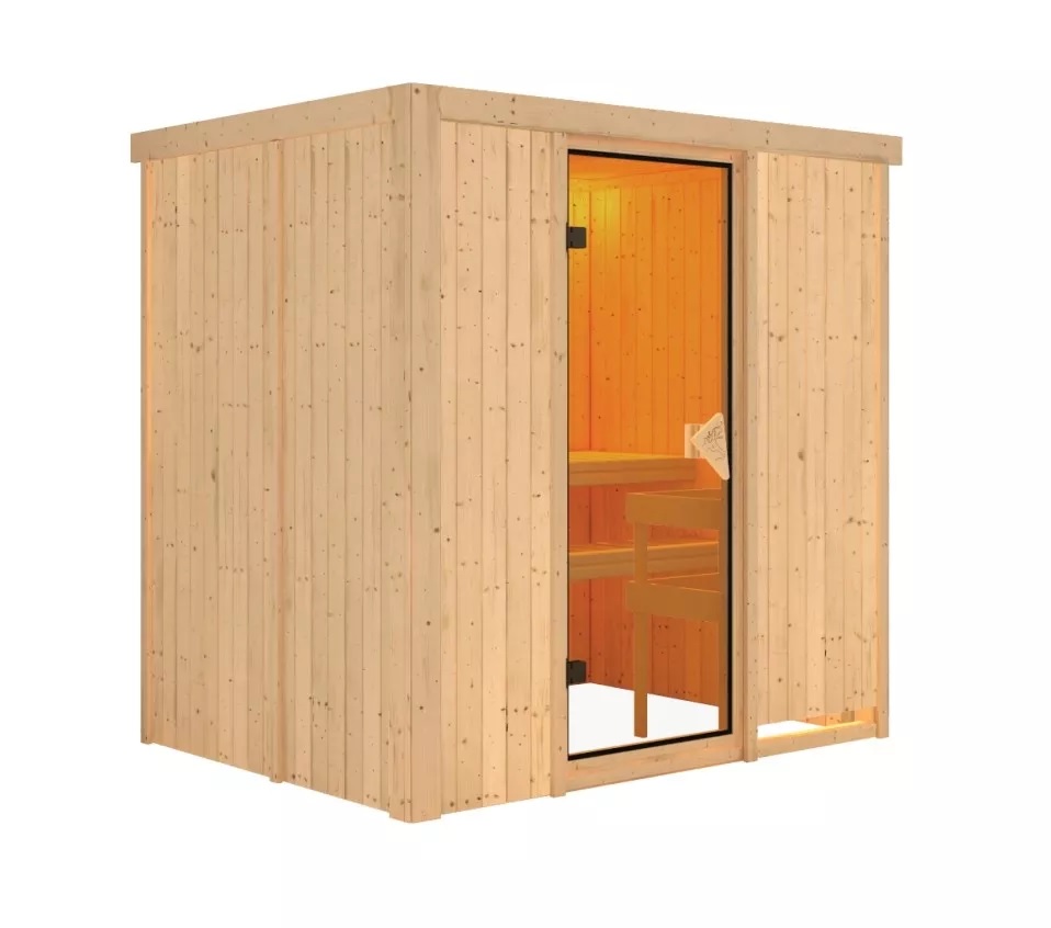 Sauna fińska przeznaczona dla dwóch osób w pozycji leżącej. Ma wymiary kwadratu: sz 196 x gł 151 x w 198 cm. Ten model sauny fińskiej przeznaczony jest do wnętrz o umiarkowanej temperaturze w domu lub mieszkaniu. Jej producent, firma KARIBU HOLZTECHNIK z Bremy w Niemczech, potrafiła swoimi produktami z sukcesem nawiązać do wielowiekowej tradycji saun skandynawskich, a jednocześnie włączyć do niej współczesne, nowoczesne technologie. Sauna w całości wykonana jest z drewna świerkowego nordyckiego o naturalnym wyglądzie. Drewno pochodzi z dalekiej północy Europy i jest całkowicie nieobrobione chemicznie (nie bejcowane ani lakierowane). Dzięki temu pozbawione jest wszelkich znanych, problematycznych substancji, które mogłyby wydzielać się z drewna podczas korzystania z sauny. Ta sauna wewnętrzna ma wyjątkowe właściwości termoizolacyjne. Ściany sauny składają się z wewnętrznej i zewnętrznej warstwy specjalnie wygładzonych desek na pióro i wpust, pomiędzy którymi znajduje się izolacja termiczna w postaci wełny mineralnej o grubości 42 mm. Całkowita grubość ściany wynosi zatem 68 mm. Tylne lub boczne niewidoczne strony zwrócone w stronę ściany pomieszczenia mają zewnętrzną część wykonaną z płyty pilśniowej. Dlatego przy tej samej izolacji termicznej są one o około 10 mm cieńsze od widocznych boków obłożonych deskami.