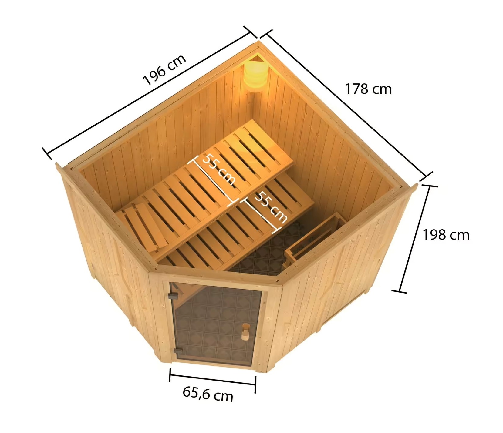 Finska sauna przeznaczona dla dwóch osób leżących. Ma wymiary: sz 196 x gł 178 x w 198 cm z narożnymi drzwiami. Model tej sauny fińskiej jest przeznaczony do ogrzewanych wnętrz domów lub mieszkań. Jej producent, firma KARIBU HOLZTECHNIK z niemieckich Brem, z powodzeniem nawiązała swoimi produktami do wielowiekowej tradycji skandynawskiego saunowania, jednocześnie wprowadzając nowoczesne technologie. Sauna jest w całości wykonana z drewna świerka skandynawskiego w naturalnym wykończeniu. Drewno pochodzi z dalekiej północy Europy i jest całkowicie nieprzetworzone chemicznie (nie jest bejcowane ani lakierowane). Dzięki temu jest wolne od wszystkich znanych problematycznych substancji, które mogłyby się uwalniać z drewna podczas saunowania. Ta sauna do wnętrz wyróżnia się wyjątkowymi właściwościami termoizolacyjnymi. Ściany sauny składają się z wewnętrznej i zewnętrznej warstwy specjalnie wygładzonych desek z piórem i wpustem, między którymi znajduje się 42-milimetrowa warstwa termoizolacyjna z wełny mineralnej. Całkowita grubość ściany wynosi zatem 68 mm. Tylne lub boczne niewidoczne strony, zwrócone w stronę ściany pomieszczenia, mają zewnętrzną warstwę wykonaną z płyty pilśniowej. Dlatego przy tej samej izolacji termicznej są o około 10 mm cieńsze niż widoczne strony pokryte deskami.