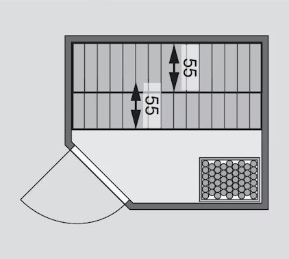 Sauna nie ma własnej podłogi i należy ją umieścić wyłącznie w pomieszczeniu z odpowiednią wykładziną podłogową, najlepiej płytkami. Saunę dostarczamy w wersji bez listwy sufitowej (profilu) przy suficie, wraz z oświetleniem LED 3 x 7,5 W.