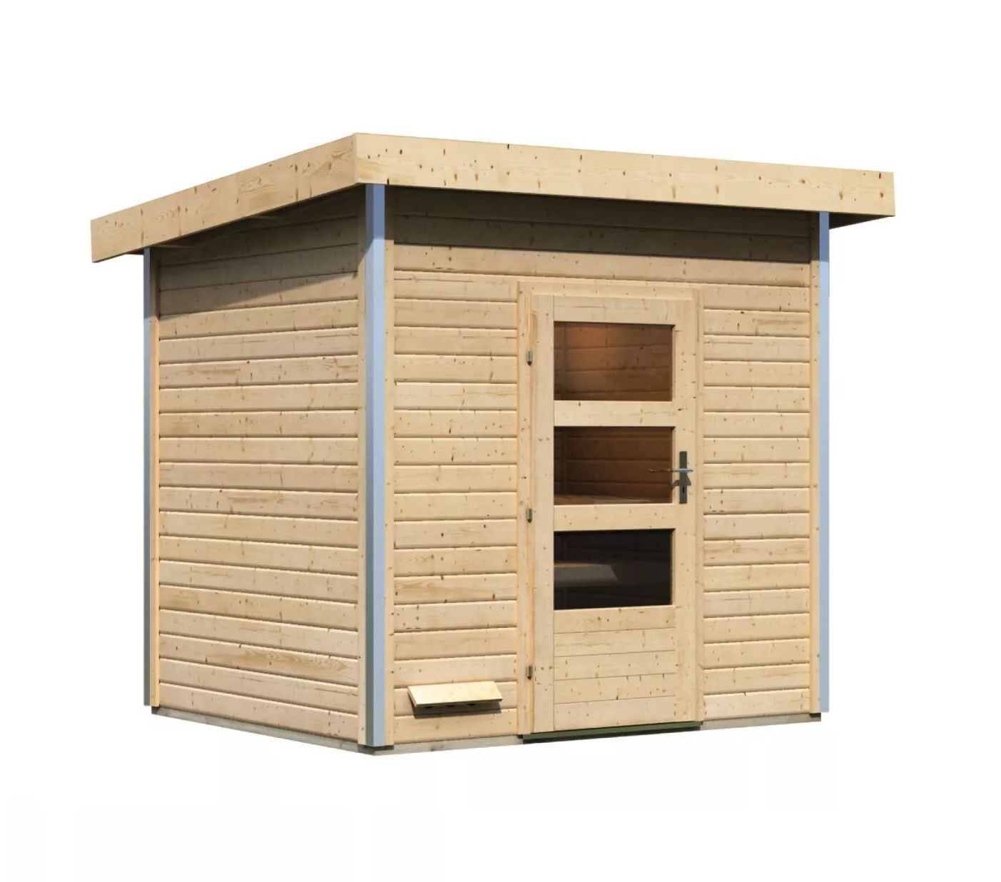 Zewnętrzna sauna fińska, ściana 38 mm, wymiary zewnętrzne sz 231 x gł 196 x w 238 cm, przeznaczona dla 3 osób.