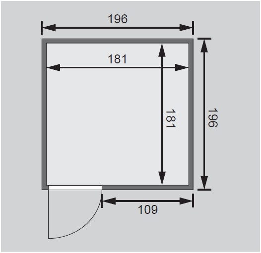 Fińska sauna przeznaczona dla dwóch leżących osób. Ma kwadratowy kształt o wymiarach sz 196 x gł 196 x w 198 cm. Ten model sauny fińskiej jest przeznaczony do ogrzewanych wnętrz domu lub mieszkania. Jej producent, firma KARIBU HOLZTECHNIK z niemieckich Brem, z powodzeniem nawiązał swoimi produktami do wielowiekowej tradycji skandynawskiego saunowania, jednocześnie wdrażając nowoczesne technologie. Sauna jest w całości wykonana z drewna świerku skandynawskiego w naturalnym wykończeniu. Drewno pochodzi z dalekiej północy Europy i jest całkowicie niepoddane obróbce chemicznej (nie jest ani bejcowane, ani lakierowane). Dzięki temu jest wolne od wszystkich znanych szkodliwych substancji, które mogłyby uwalniać się z drewna podczas saunowania.Ta sauna wewnętrzna charakteryzuje się wyjątkowymi właściwościami termoizolacyjnymi. Ściany sauny składają się z wewnętrznej i zewnętrznej warstwy specjalnie wygładzonych desek z piórem i wpustem, pomiędzy którymi znajduje się 42-milimetrowa izolacja termiczna z wełny mineralnej. Całkowita grubość ściany wynosi zatem 68 mm. Tylne lub boczne niewidoczne strony, skierowane ku ścianie pomieszczenia, mają zewnętrzną stronę wykonaną z płyty pilśniowej. Dlatego przy tej samej izolacji termicznej są o około 10 mm cieńsze niż widoczne strony pokryte boazerią.