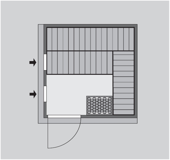 Sauna nie ma własnej podłogi i należy ją umieścić wyłącznie w pomieszczeniu z odpowiednią wykładziną podłogową, najlepiej płytkami. Saunę dostarczamy w wersji bez listwy sufitowej (profilu) przy suficie, wraz z oświetleniem LED 3 x 7,5 W.