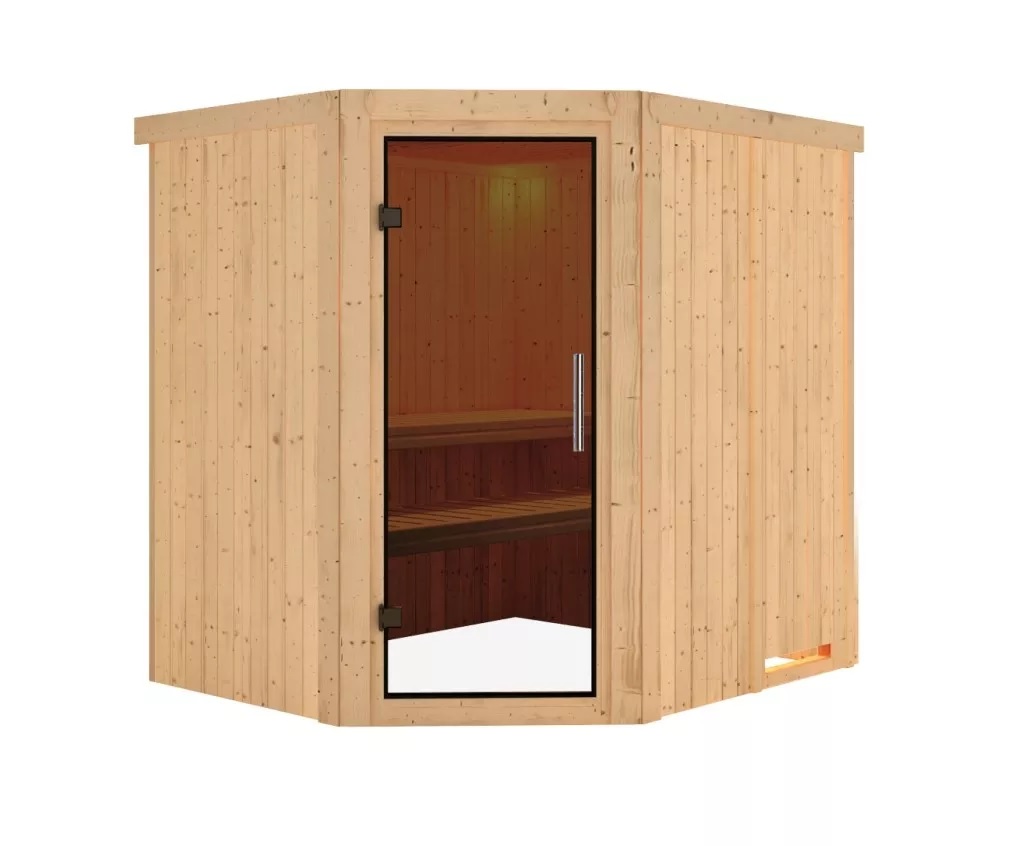 Fińska sauna przeznaczona dla dwóch leżących osób. Ma wymiary sz 196 x gł 170 x w 198 cm z narożnymi drzwiami. Ten model sauny fińskiej jest przeznaczony do ogrzewanych wnętrz domu lub mieszkania. Jej producent, firma KARIBU HOLZTECHNIK z niemieckich Brem, z powodzeniem nawiązał swoimi produktami do wielowiekowej tradycji skandynawskiego saunowania, jednocześnie wdrażając nowoczesne technologie. Sauna jest w całości wykonana z drewna świerku skandynawskiego w naturalnym wykończeniu. Drewno pochodzi z dalekiej północy Europy i jest całkowicie niepoddane obróbce chemicznej (nie jest ani bejcowane, ani lakierowane). Dzięki temu jest wolne od wszystkich znanych szkodliwych substancji, które mogłyby uwalniać się z drewna podczas saunowania.Ta sauna wewnętrzna charakteryzuje się wyjątkowymi właściwościami termoizolacyjnymi. Ściany sauny składają się z wewnętrznej i zewnętrznej warstwy specjalnie wygładzonych desek z piórem i wpustem, pomiędzy którymi znajduje się 42-milimetrowa izolacja termiczna z wełny mineralnej. Całkowita grubość ściany wynosi zatem 68 mm. Tylne lub boczne niewidoczne strony, skierowane ku ścianie pomieszczenia, mają zewnętrzną stronę wykonaną z płyty pilśniowej. Dlatego przy tej samej izolacji termicznej są o około 10 mm cieńsze niż widoczne strony pokryte boazerią.