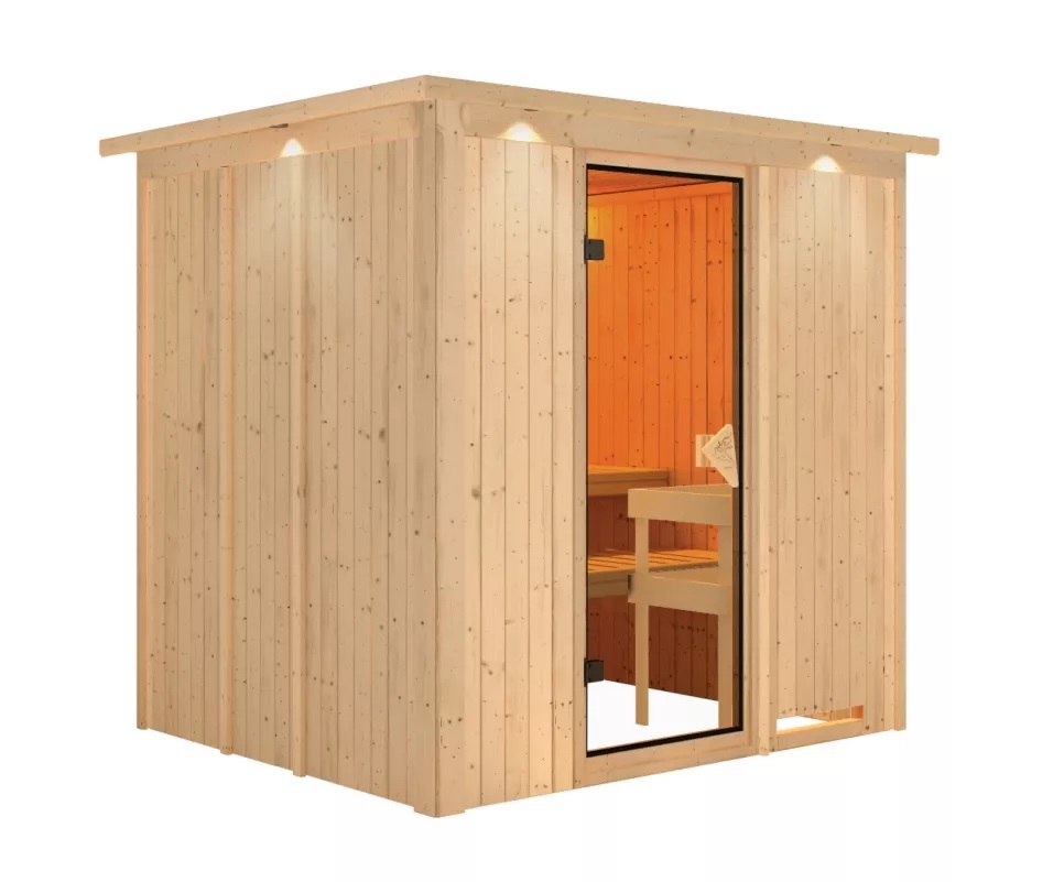 Fińska sauna przeznaczona dla dwóch leżących osób. Ma prostokątny kształt o wymiarach sz 196 x gł 170 x w 198 cm. Ten model sauny fińskiej jest przeznaczony do ogrzewanych wnętrz domu lub mieszkania. Jej producent, firma KARIBU HOLZTECHNIK z niemieckich Brem, z powodzeniem nawiązał swoimi produktami do wielowiekowej tradycji skandynawskiego saunowania, jednocześnie wdrażając w nią nowoczesne technologie. Sauna jest w całości wykonana z drewna świerku skandynawskiego w naturalnym wykończeniu. Drewno pochodzi z dalekiej północy Europy i jest całkowicie niepoddane obróbce chemicznej (nie jest ani bejcowane, ani lakierowane). Dzięki temu jest wolne od wszystkich znanych szkodliwych substancji, które mogłyby się uwalniać z drewna podczas saunowania. Ta sauna wewnętrzna charakteryzuje się wyjątkowymi właściwościami termoizolacyjnymi. Ściany sauny składają się z wewnętrznej i zewnętrznej warstwy specjalnie wygładzonych desek na pióro i wpust, pomiędzy którymi znajduje się 42-milimetrowa izolacja termiczna z wełny mineralnej. Całkowita grubość ściany wynosi zatem 68 mm. Tylne lub boczne niewidoczne strony, skierowane ku ścianie pomieszczenia, mają zewnętrzną stronę wykonaną z płyty pilśniowej. Dlatego przy tej samej izolacji termicznej są o około 10 mm cieńsze niż widoczne strony pokryte boazerią.
