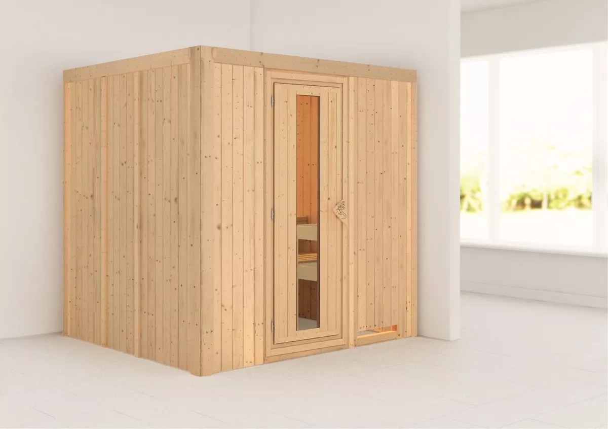 Fińska sauna przeznaczona dla dwóch leżących osób. Ma prostokątny kształt o wymiarach sz 196 x gł 170 x w 198 cm. Ten model sauny fińskiej jest przeznaczony do ogrzewanych wnętrz domu lub mieszkania. Jej producent, firma KARIBU HOLZTECHNIK z niemieckich Brem, z powodzeniem nawiązał swoimi produktami do wielowiekowej tradycji skandynawskiego saunowania, jednocześnie wdrażając w nią nowoczesne technologie. Sauna jest w całości wykonana z drewna świerku skandynawskiego w naturalnym wykończeniu. Drewno pochodzi z dalekiej północy Europy i jest całkowicie niepoddane obróbce chemicznej (nie jest ani bejcowane, ani lakierowane). Dzięki temu jest wolne od wszystkich znanych szkodliwych substancji, które mogłyby się uwalniać z drewna podczas saunowania. Ta sauna wewnętrzna charakteryzuje się wyjątkowymi właściwościami termoizolacyjnymi. Ściany sauny składają się z wewnętrznej i zewnętrznej warstwy specjalnie wygładzonych desek na pióro i wpust, pomiędzy którymi znajduje się 42-milimetrowa izolacja termiczna z wełny mineralnej. Całkowita grubość ściany wynosi zatem 68 mm. Tylne lub boczne niewidoczne strony, skierowane ku ścianie pomieszczenia, mają zewnętrzną stronę wykonaną z płyty pilśniowej. Dlatego przy tej samej izolacji termicznej są o około 10 mm cieńsze niż widoczne strony pokryte boazerią.