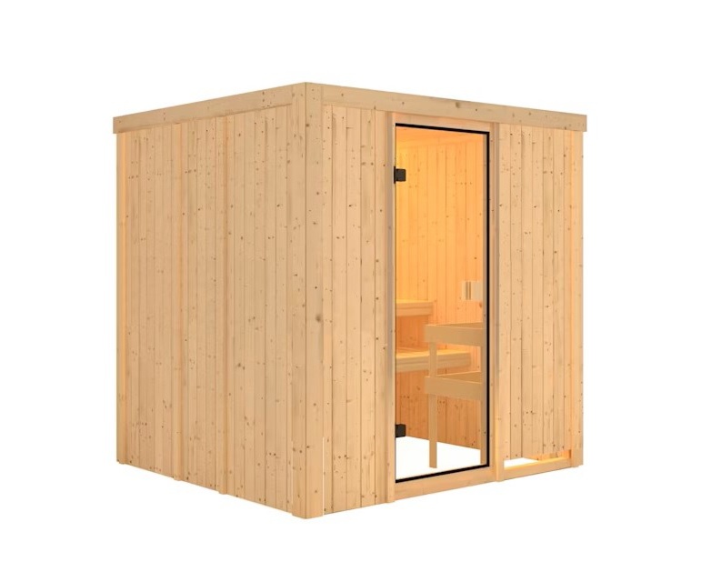 Sauna fińska przeznaczona dla dwóch osób leżących. Ma wymiary: sz 196 cm, gł 178 cm, w 198 cm. Ten model sauny fińskiej jest przeznaczony do ogrzewanych wnętrz domu lub mieszkania. Jej producent, firma KARIBU HOLZTECHNIK z niemieckiego Bremy, z powodzeniem nawiązał swoimi produktami do wielowiekowej tradycji skandynawskiego saunowania, jednocześnie wprowadzając do niej nowoczesne technologie. Sauna jest w całości wykonana z drewna świerku skandynawskiego w naturalnym wykończeniu. Drewno pochodzi z odległej północy Europy i jest całkowicie nieprzetworzone chemicznie (nie jest ani impregnowane, ani lakierowane). W efekcie jest wolne od wszelkich znanych substancji problematycznych, które mogłyby uwalniać się z drewna podczas saunowania. Ta wewnętrzna sauna cechuje się wyjątkowymi właściwościami termoizolacyjnymi. Ściany sauny składają się z wewnętrznej i zewnętrznej warstwy specjalnie wygładzonych desek z piórem i wpustem, pomiędzy którymi znajduje się 42-milimetrowa izolacja termiczna z wełny mineralnej. Całkowita grubość ściany wynosi zatem 68 mm. Tylne lub boczne niewidoczne strony, przylegające do ściany pomieszczenia, mają zewnętrzną warstwę wykonaną z płyty pilśniowej. Dlatego przy zachowaniu tej samej izolacji termicznej są o około 10 mm cieńsze niż widoczne strony pokryte deskami.