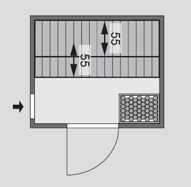 Sauna nie ma własnej podłogi i należy ją umieścić wyłącznie w pomieszczeniu z odpowiednią wykładziną podłogową, najlepiej płytkami. Saunę dostarczamy w wersji bez listwy sufitowej (profilu) przy suficie, wraz z oświetleniem LED 3 x 7,5 W.