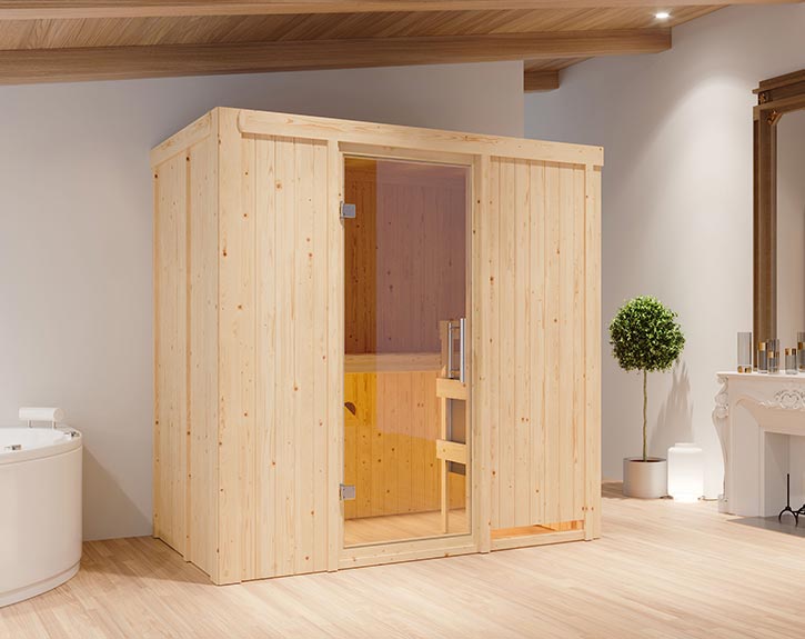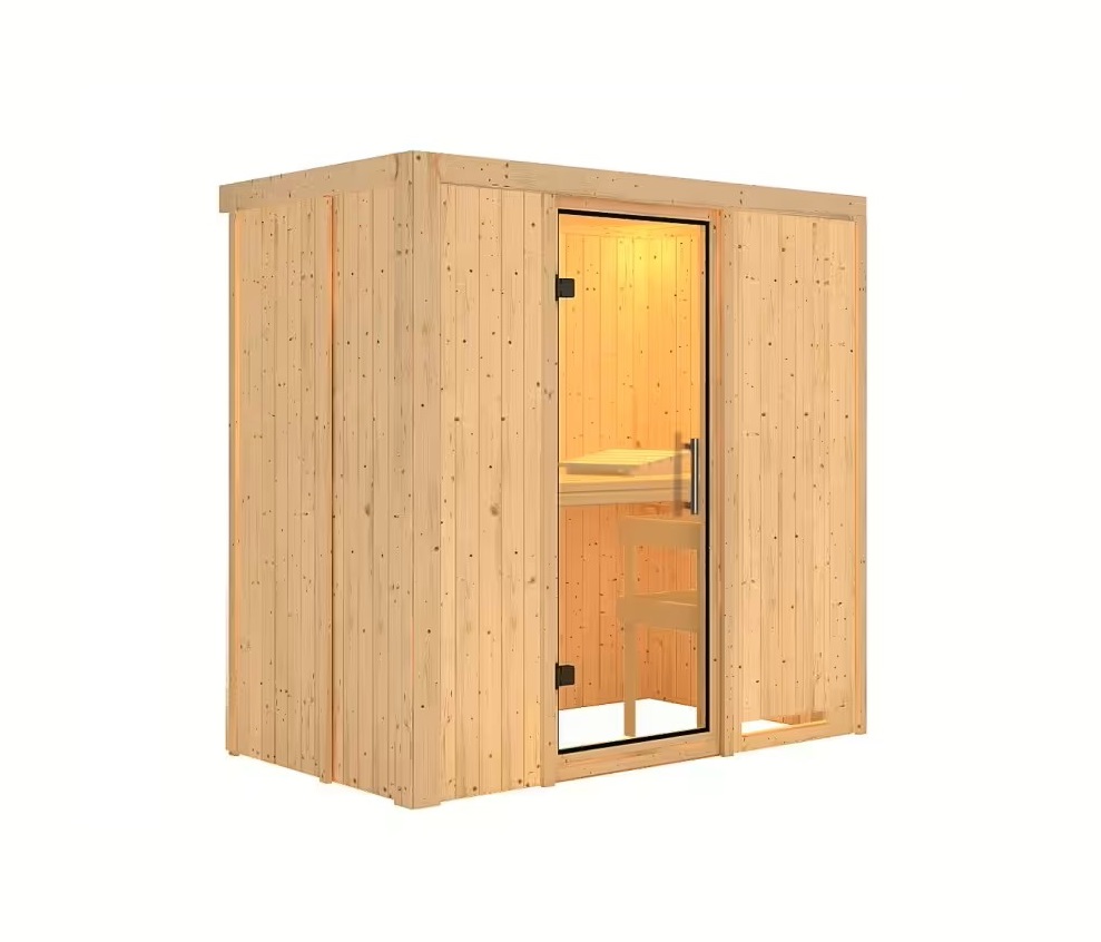 Finska sauna przeznaczona dla dwóch osób. Ma wymiary: sz 196 x gł 118 x w 198 cm. Model tej sauny fińskiej jest przeznaczony do ogrzewanych wnętrz domów lub mieszkań. Jej producent, firma KARIBU HOLZTECHNIK z niemieckich Brem, z powodzeniem nawiązała swoimi produktami do wielowiekowej tradycji skandynawskiego saunowania, jednocześnie wprowadzając nowoczesne technologie. Sauna jest w całości wykonana z drewna świerka skandynawskiego w naturalnym wykończeniu. Drewno pochodzi z dalekiej północy Europy i jest całkowicie nieprzetworzone chemicznie (nie jest bejcowane ani lakierowane). Dzięki temu jest wolne od wszystkich znanych problematycznych substancji, które mogłyby się uwalniać z drewna podczas saunowania. Ta sauna do wnętrz wyróżnia się wyjątkowymi właściwościami termoizolacyjnymi. Ściany sauny składają się z wewnętrznej i zewnętrznej warstwy specjalnie wygładzonych desek z piórem i wpustem, między którymi znajduje się 42-milimetrowa warstwa termoizolacyjna z wełny mineralnej. Całkowita grubość ściany wynosi zatem 68 mm. Tylne lub boczne niewidoczne strony, zwrócone w stronę ściany pomieszczenia, mają zewnętrzną warstwę wykonaną z płyty pilśniowej. Dlatego przy tej samej izolacji termicznej są o około 10 mm cieńsze niż widoczne strony pokryte deskami.