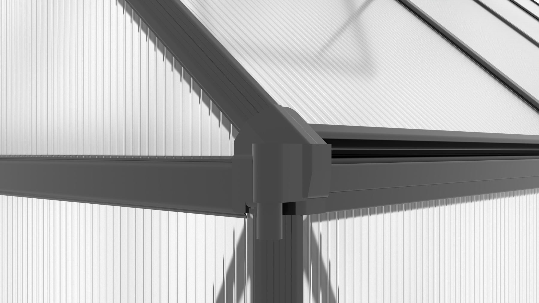 Szklarnie z serii SARANA to jeden z najlepiej sprzedających się modeli szklarni marki LANIT PLAST. Konstrukcja ramy wykonana jest z anodowanych profili aluminiowych, które gwarantują długą żywotność i dużą wytrzymałość. Przeszklenie składa się z dwuściennych płyt z poliwęglanu komórkowego o grubości 4 mm, które zapewniają doskonałe właściwości termoizolacyjne i optymalną ochronę przed promieniowaniem UV. Deski mocowane są na stałe do płaskich i narożnych profili H, co zapewnia maksymalną stabilność i trwałość całej konstrukcji. Szklarnię wyposażono także w zamknięte krawędzie boczne z poliwęglanu, które przyczyniają się do jej wieloletniej trwałości. Główną zaletą modelu są wzmocnione profile nośne, które znacznie zwiększają jego wytrzymałość i odporność na warunki atmosferyczne, takie jak silne obciążenie wiatrem i śniegiem.