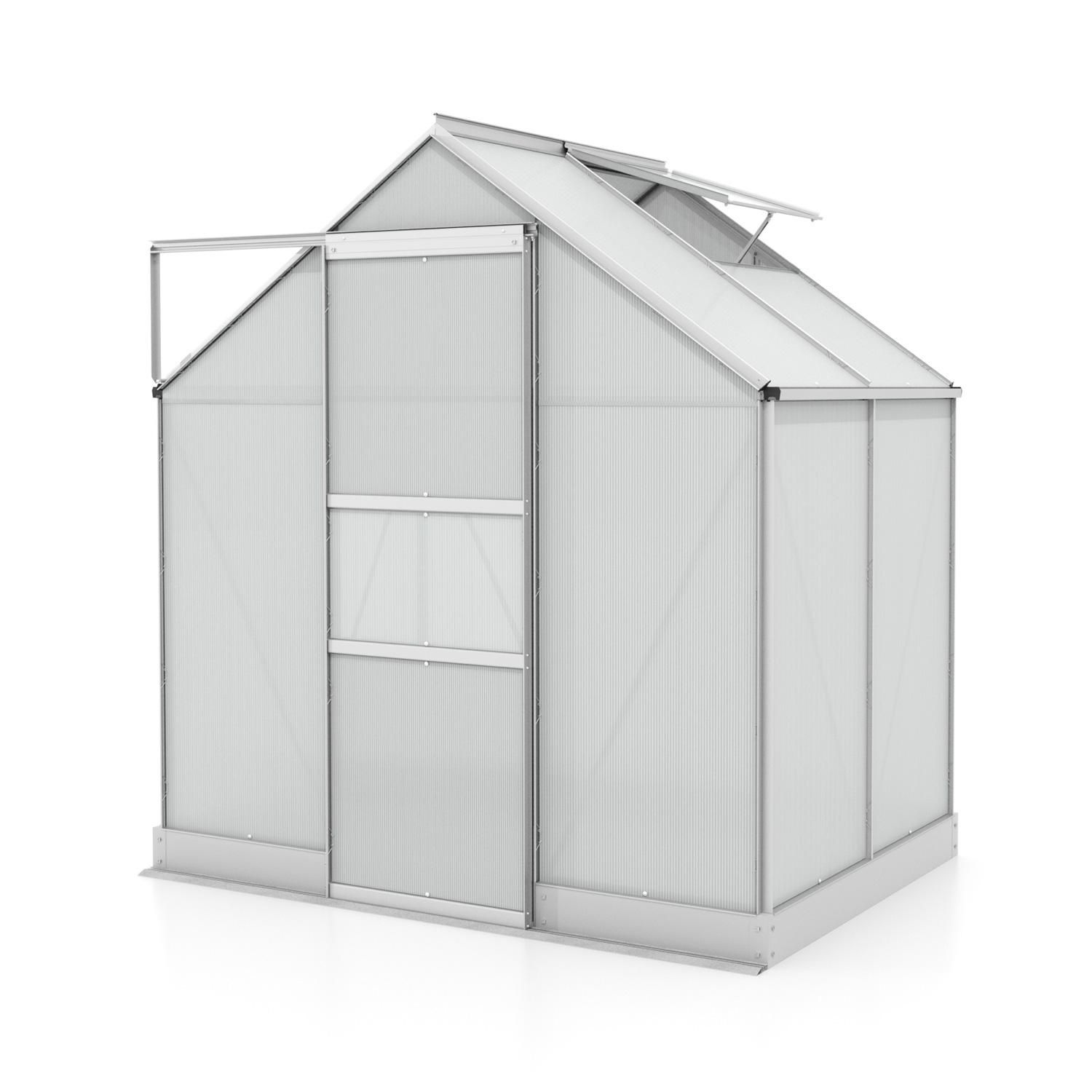 Szklarnia aluminiowa, sz 1,95 x gł 1,37 m, kolor srebrny, 1x okno dachowe, poliwęglan 6 mm, podstawa w cenie, powierzchnia 2,67 m2.