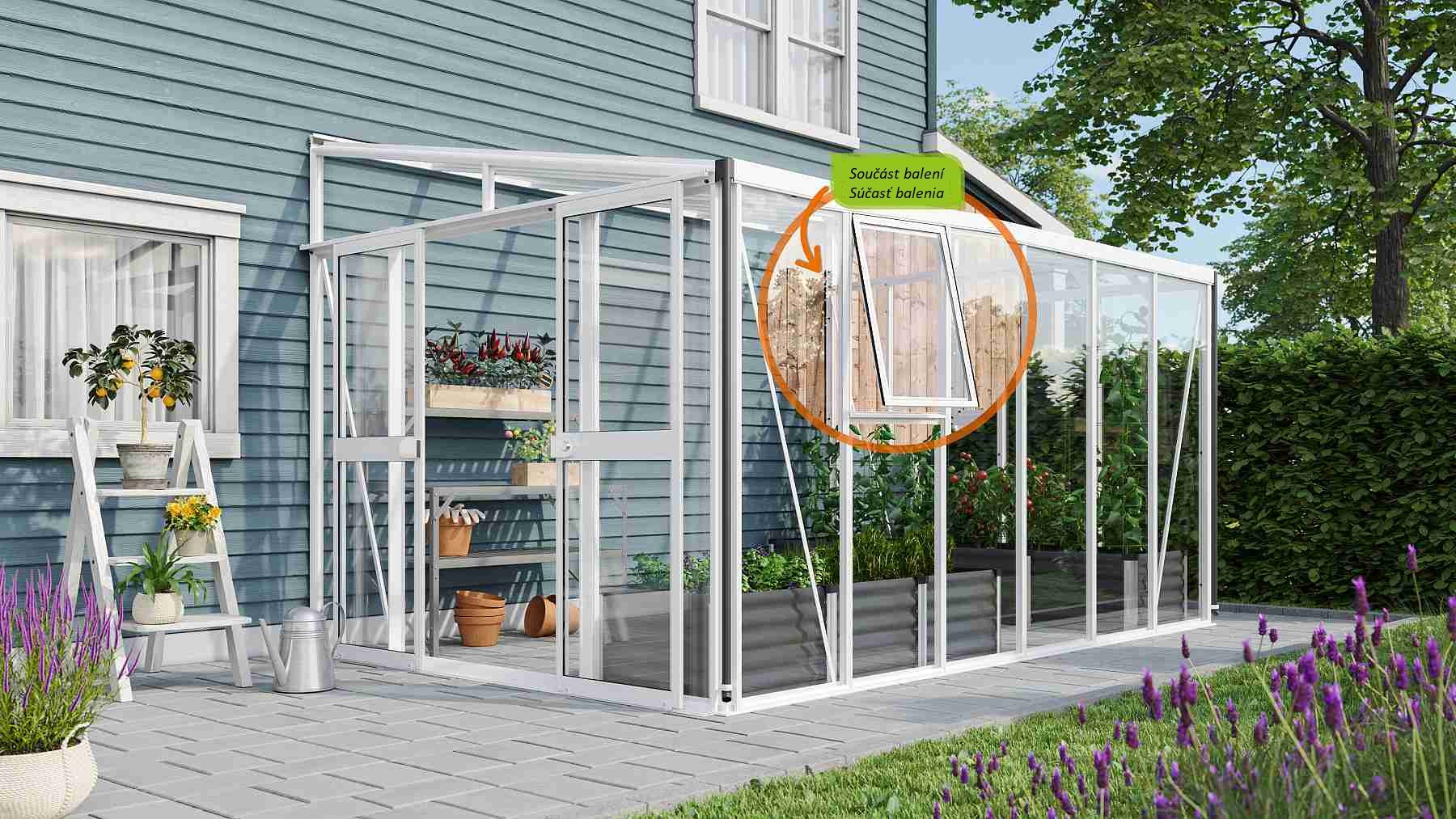 Zawartość opakowania obejmuje dwuskrzydłowe drzwi przesuwne (sz x w otworu = 1,19 x 1,77 m), profile aluminiowe, przeszklenie, 2x boczne okienko wentylacyjne z ręcznym otwieraniem, 1x rynnę w zestawie z dwoma rurami spustowymi, 1x zamek cylindryczny oraz wszelkie elementy montażowe. Do szklarni można dokupić szereg dodatkowego wyposażenia premium – półki, regały, kolejne okienka dachowe i boczne, automatyczne otwieracze do tych okienek, termometry, higrometry. Baleno w kartonie. Oszklenie jest zapakowane w bezzwrotną drewnianą skrzynię.
