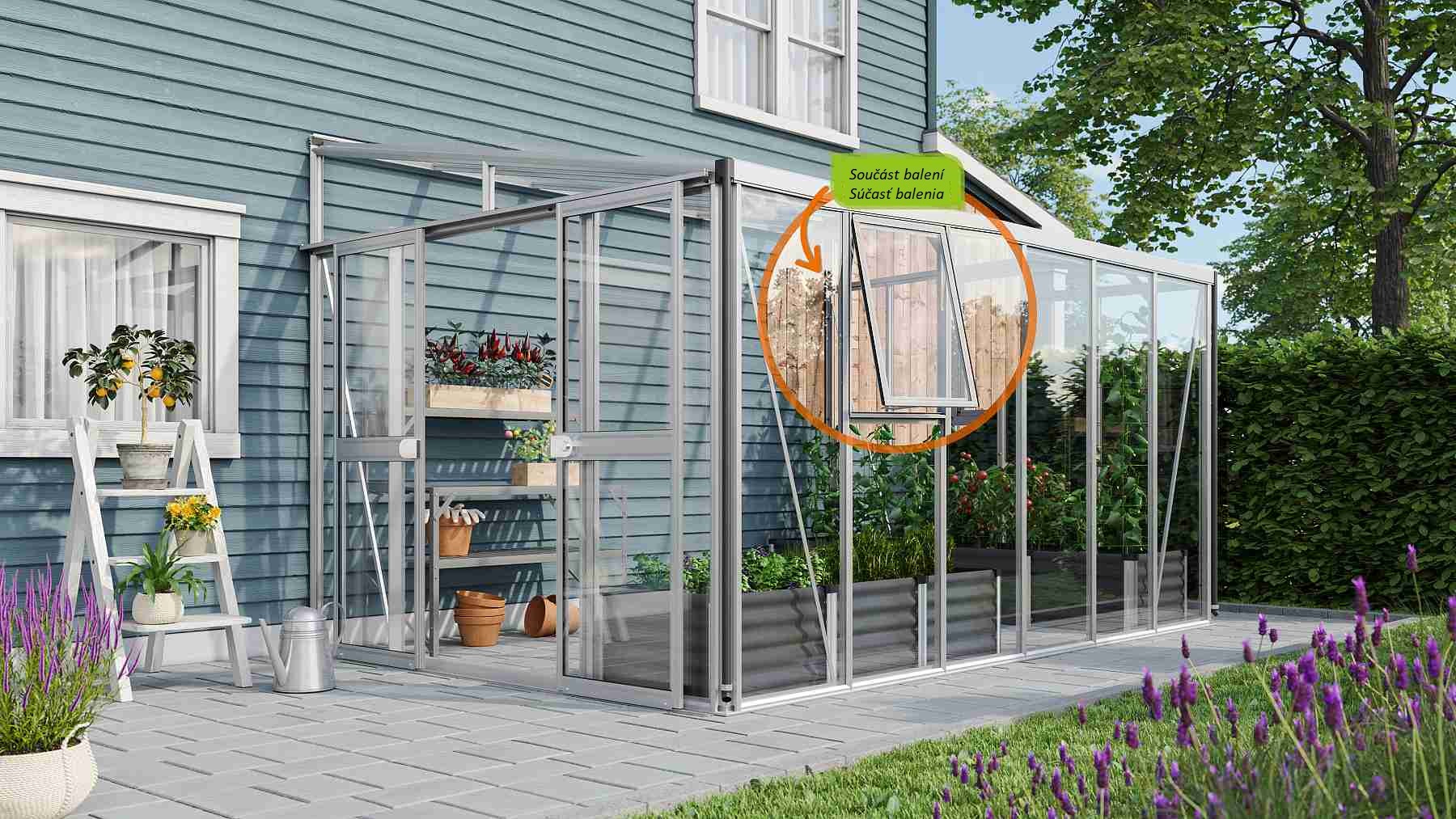 Zawartość opakowania obejmuje dwuskrzydłowe drzwi przesuwne (sz x w otworu = 1,19 x 1,77 m), profile aluminiowe, przeszklenie, 2x boczne okienko wentylacyjne z ręcznym otwieraniem, 1x rynnę w zestawie z dwoma rurami spustowymi, 1x zamek cylindryczny oraz wszelkie elementy montażowe. Do szklarni można dokupić szereg dodatkowego wyposażenia premium – półki, regały, kolejne okienka dachowe i boczne, automatyczne otwieracze do tych okienek, termometry, higrometry. Baleno w kartonie. Oszklenie jest zapakowane w bezzwrotną drewnianą skrzynię.