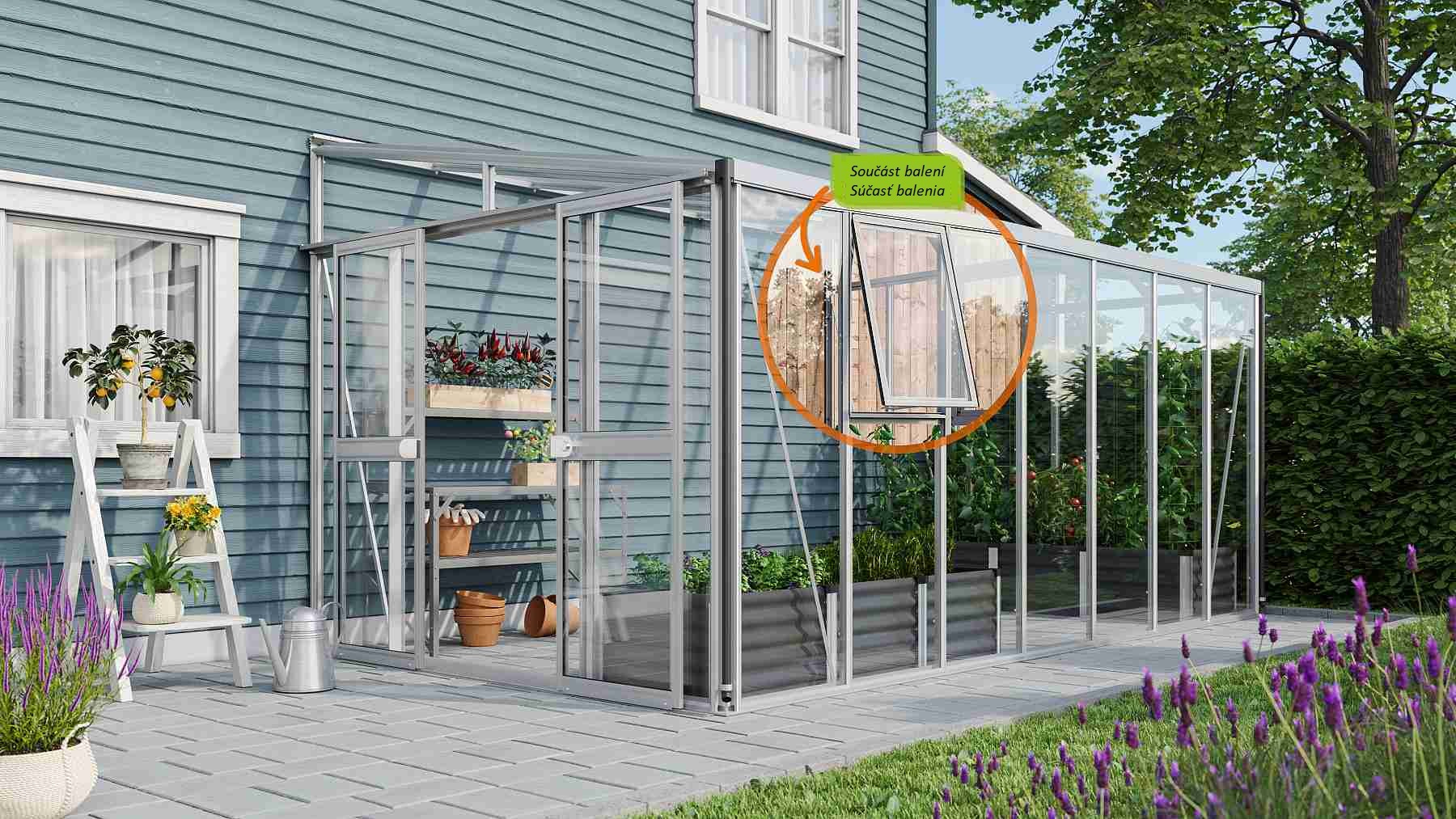 Zawartość opakowania obejmuje dwuskrzydłowe drzwi przesuwne (sz x w otworu = 1,19 x 1,77 m), profile aluminiowe, przeszklenie, 3x boczne okienko wentylacyjne z ręcznym otwieraniem, 1x rynnę w zestawie z dwoma rurami spustowymi, 1x zamek cylindryczny oraz wszelkie elementy montażowe. Do szklarni można dokupić szereg dodatkowego wyposażenia premium – półki, regały, kolejne okienka dachowe i boczne, automatyczne otwieracze do tych okienek, termometry, higrometry. Baleno w kartonie. Oszklenie jest zapakowane w bezzwrotną drewnianą skrzynię.