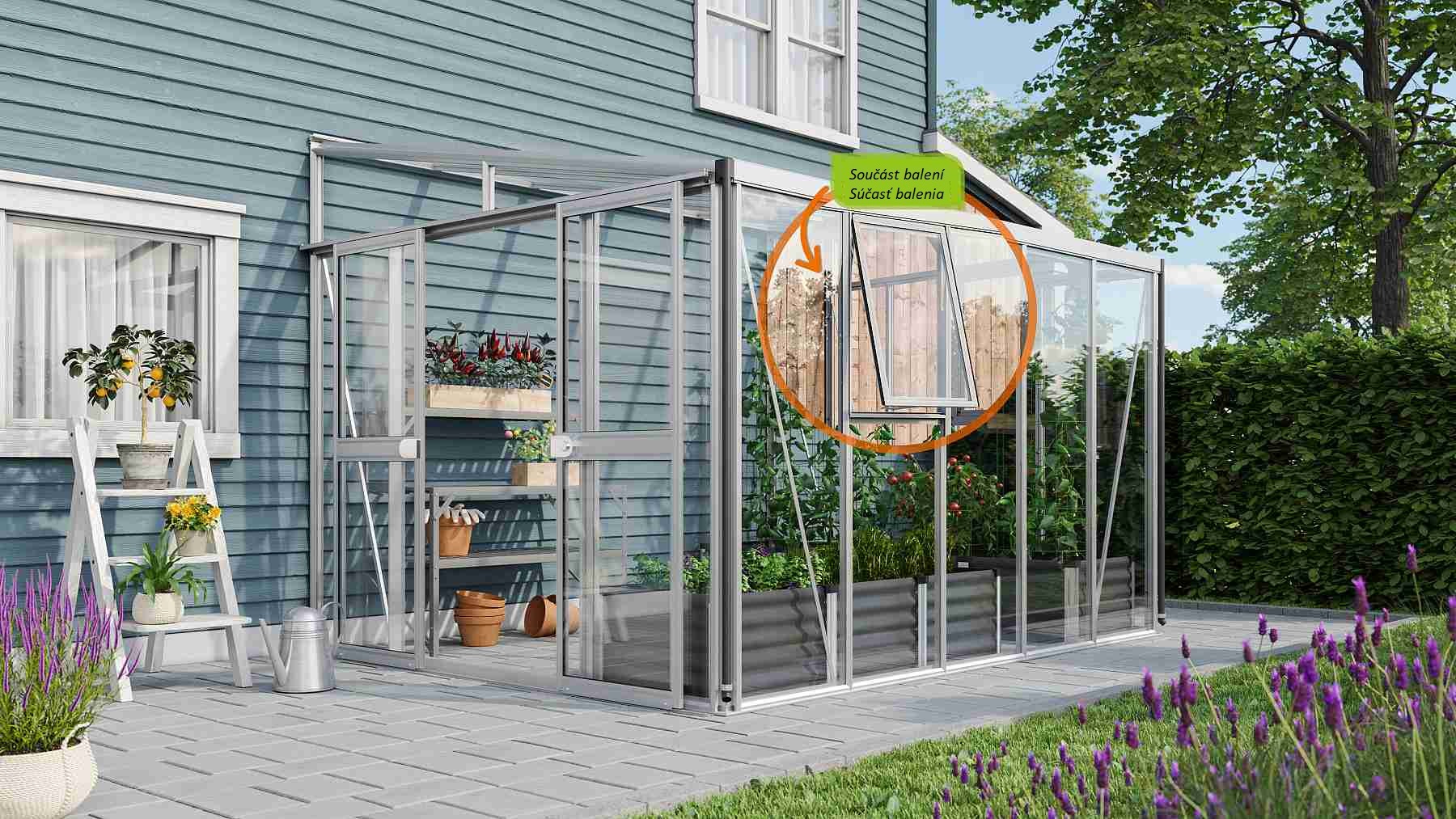 Zawartość opakowania obejmuje dwuskrzydłowe drzwi przesuwne (sz x w otworu = 1,19 x 1,77 m), profile aluminiowe, przeszklenie, 2x boczne okienko wentylacyjne z ręcznym otwieraniem, 1x rynnę w zestawie z dwoma rurami spustowymi, 1x zamek cylindryczny oraz wszelkie elementy montażowe. Do szklarni można dokupić szereg dodatkowego wyposażenia premium – półki, regały, kolejne okienka dachowe i boczne, automatyczne otwieracze do tych okienek, termometry, higrometry. Baleno w kartonie. Oszklenie jest zapakowane w bezzwrotną drewnianą skrzynię.