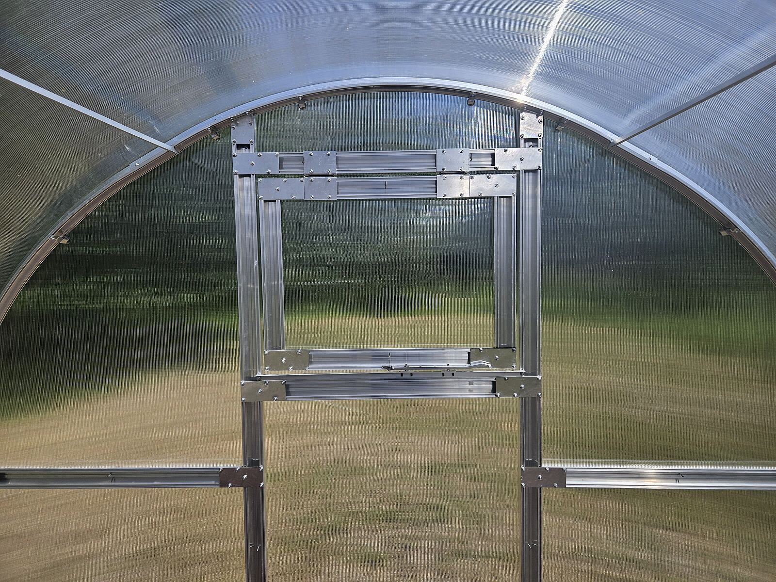 szerokość 2,9 m, długość około 4 / 6 / 8 m, masywny profil aluminiowy o grubości 1 mm i szerokości 65 mm, rozstaw łuków 100 cm, wewnętrzne podpory konstrukcji łukowej, podwójne drzwi z przodu, okno wentylacyjne z tyłu, przeszklenia należy wyciąć z dostarczonych płyt poliwęglanowych. |