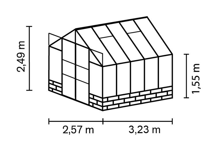 Szklarnia aluminiowa, sz 2,57 x gł 3,23 m, kolor czarny, 4x okna dachowe, szkło hartowane przezroczyste 3 mm, pow. 8,30 m2.