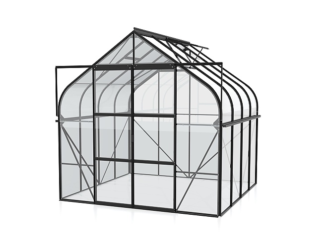 Szklarnia aluminiowa, sz 2,64 x gł 2,58 m, kolor czarny, 2x okno dachowe, szkło hartowane przezroczyste 3 mm, pow 6,81 m2.