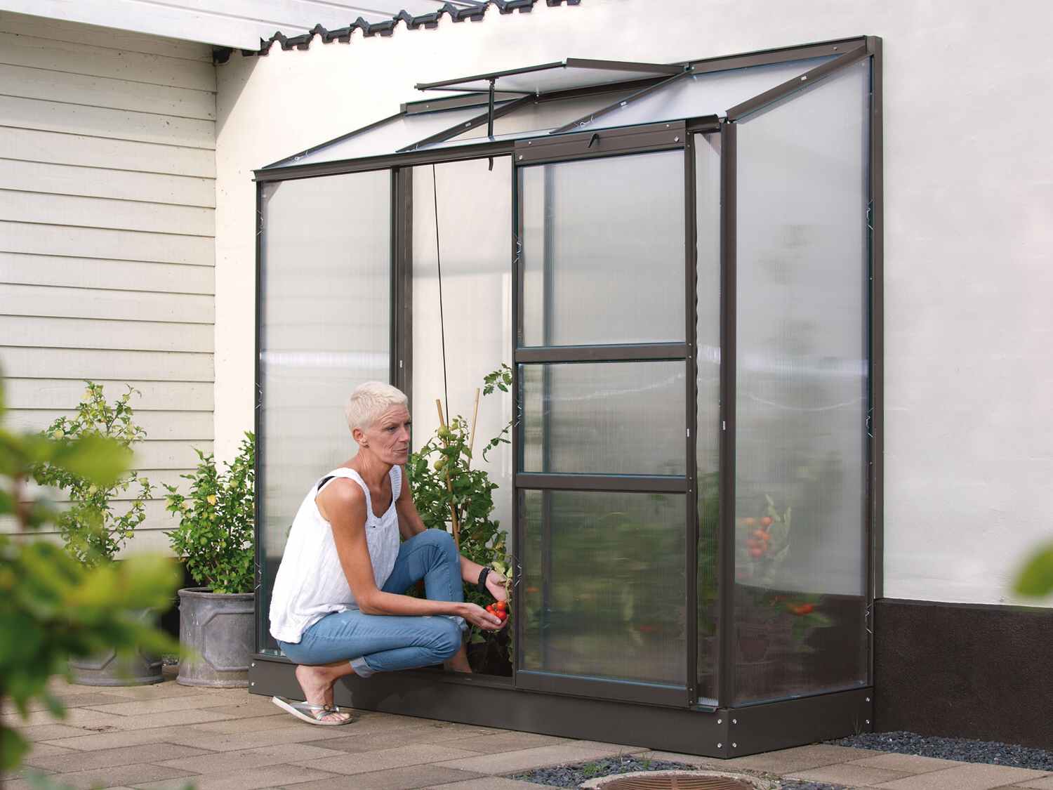 Szklarnia aluminiowa do ściany, sz 1,93 x gł 0,69 m, kolor czarny, 1x okno dachowe, poliwęglan o grubości 4 mm z Wielkiej Brytanii, pow 1,33 m2.
