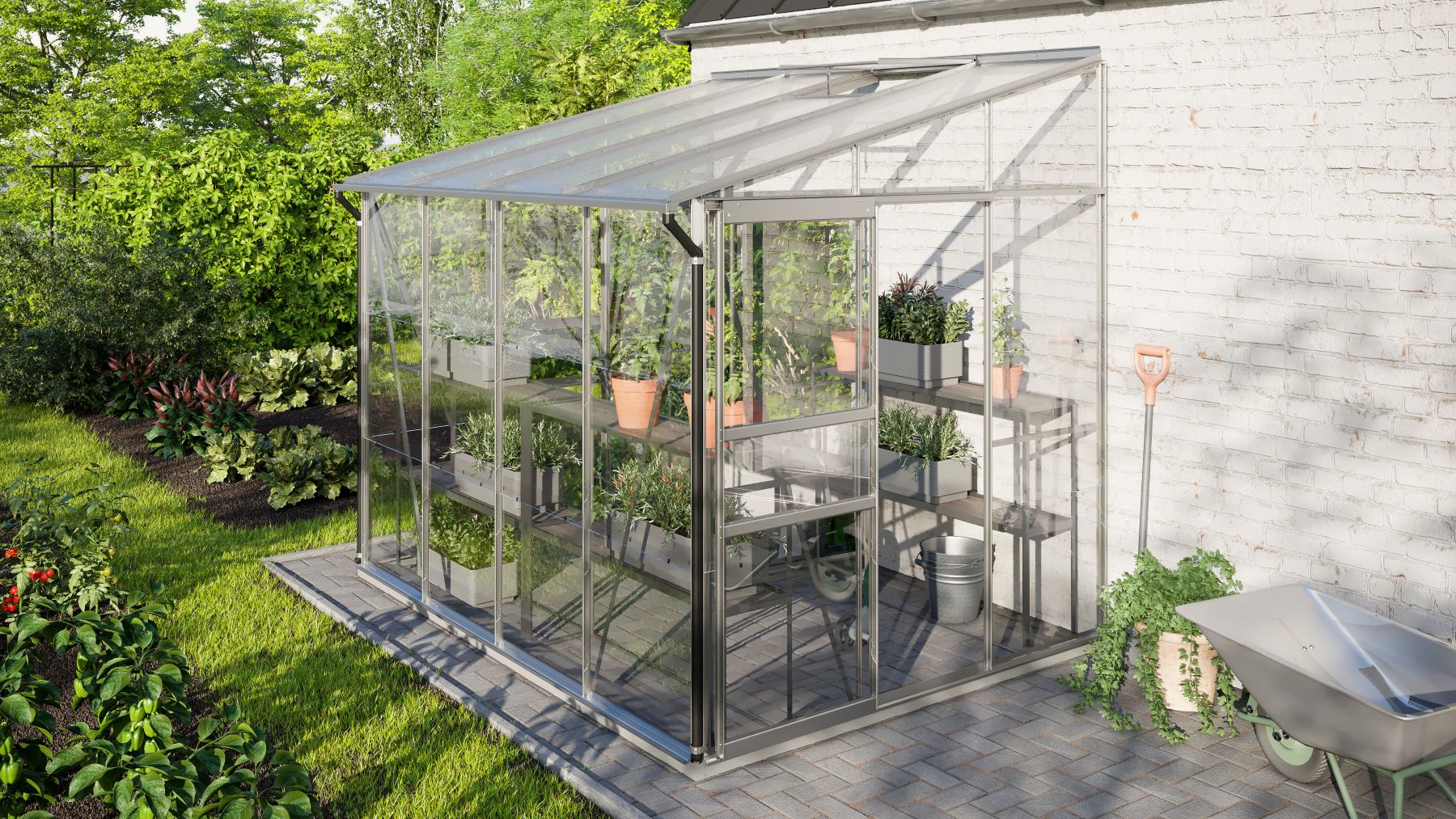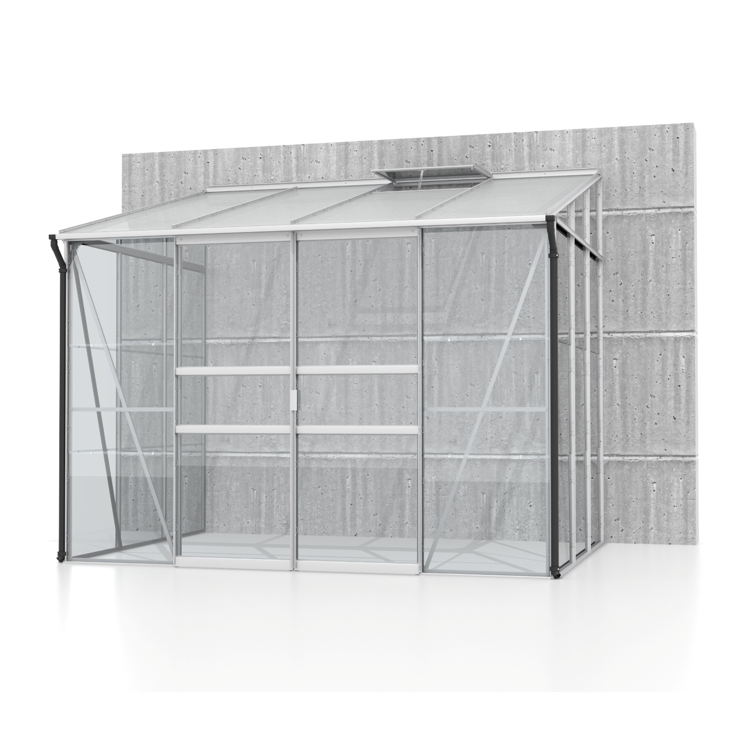 Szklarnia aluminiowa do ściany, sz 2,62 x gł 2,01 m, kolor srebrny, 1x okno dachowe, szkło hartowane 3 mm + PC komorowy 6 mm, pow 5,27 m2.