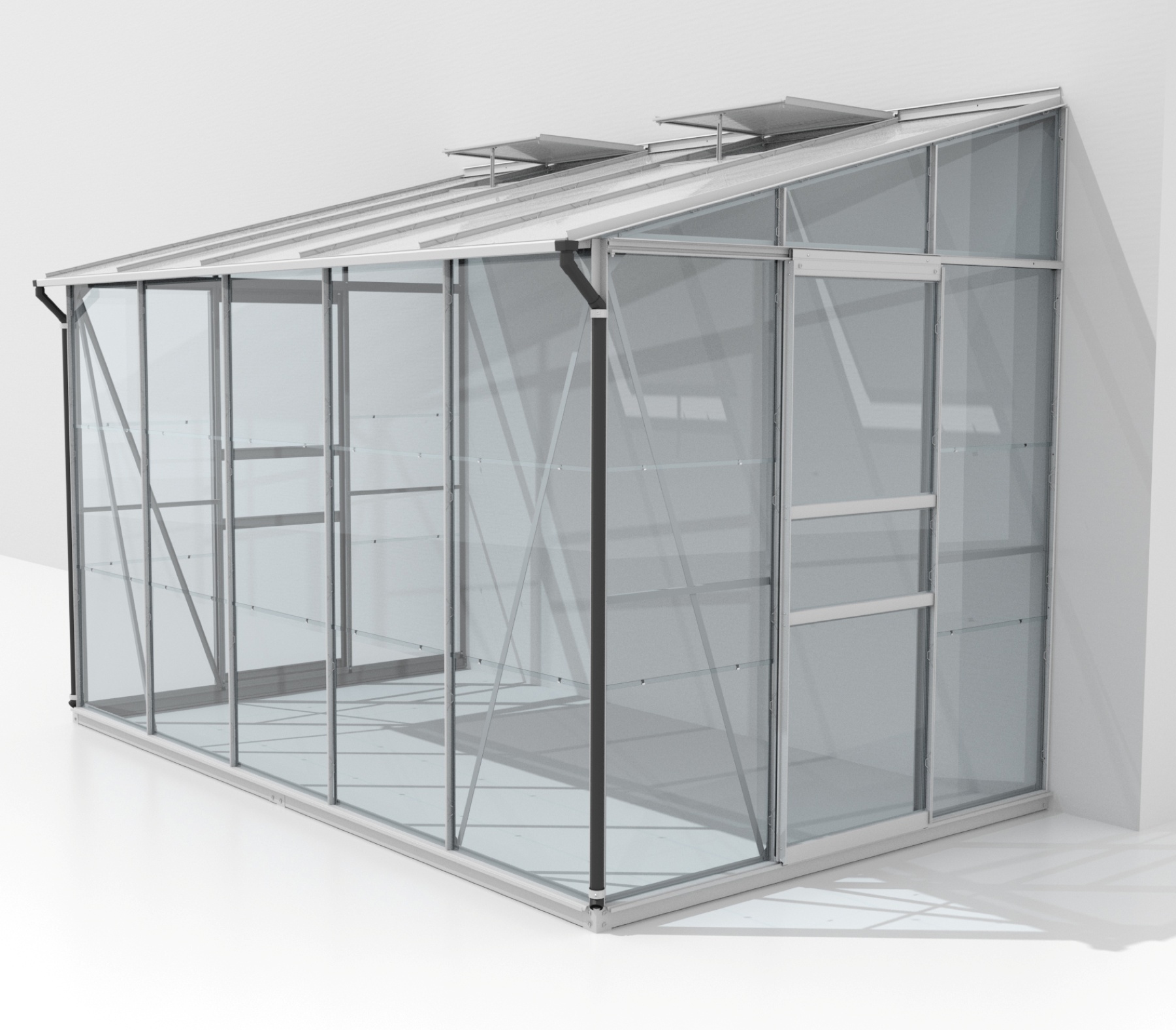 Szklarnia aluminiowa do ściany, sz 3,24 x gł 2,01 m, kolor srebrny, 2x okno dachowe, szkło hartowane 3 mm + PC komorowy 6 mm, pow 6,51 m2.