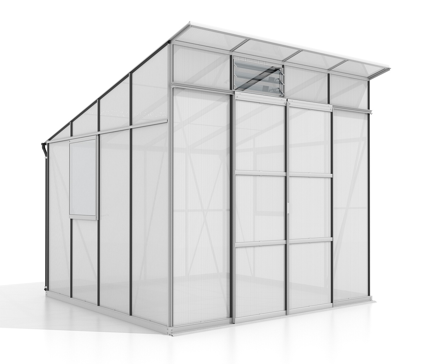 Szklarnia aluminiowa, sz 2,54 x gł 2,54 m, kolor srebrny, 2x boczne + 1x okno żaluzjowe, poliwęglan o grubości 6 mm, drzwi przesuwne, pow 6,45 m2.