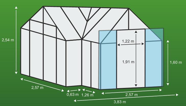 Zestaw zawiera podwójne drzwi przesuwne (sz x w = 1,22 x 1,91 m), metalową podstawę, profile AL, przeszklenie, 4x okna wentylacyjne dachowe z ręcznym otwieraniem, 3x rynny spustowe, wszystkie materiały łączące. Szklarnię można zbudować na podstawie murowanej (betonowej, innej) lub na podstawie z blachy ocynkowanej (w zestawie). Do szklarni można dokupić szereg akcesoriów - półki, stojaki, dodatkowe wentylacyjne okna dachowe i boczne, automatyczne otwieracze do tych okien, zestawy rynien, termometry, higrometry. Baleno w kartonie. Oszklenie jest zapakowane w bezzwrotną drewnianą skrzynię.
