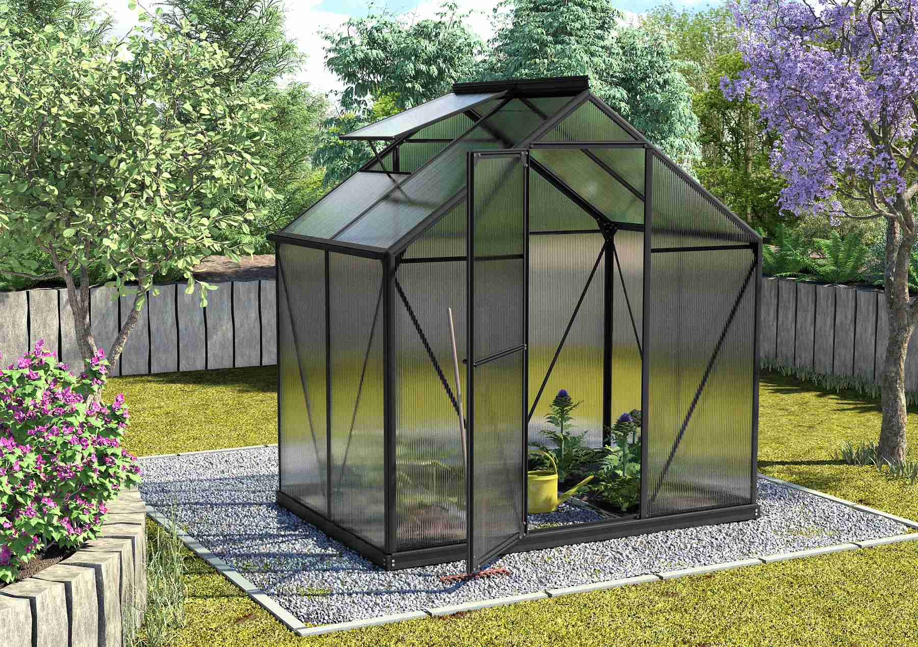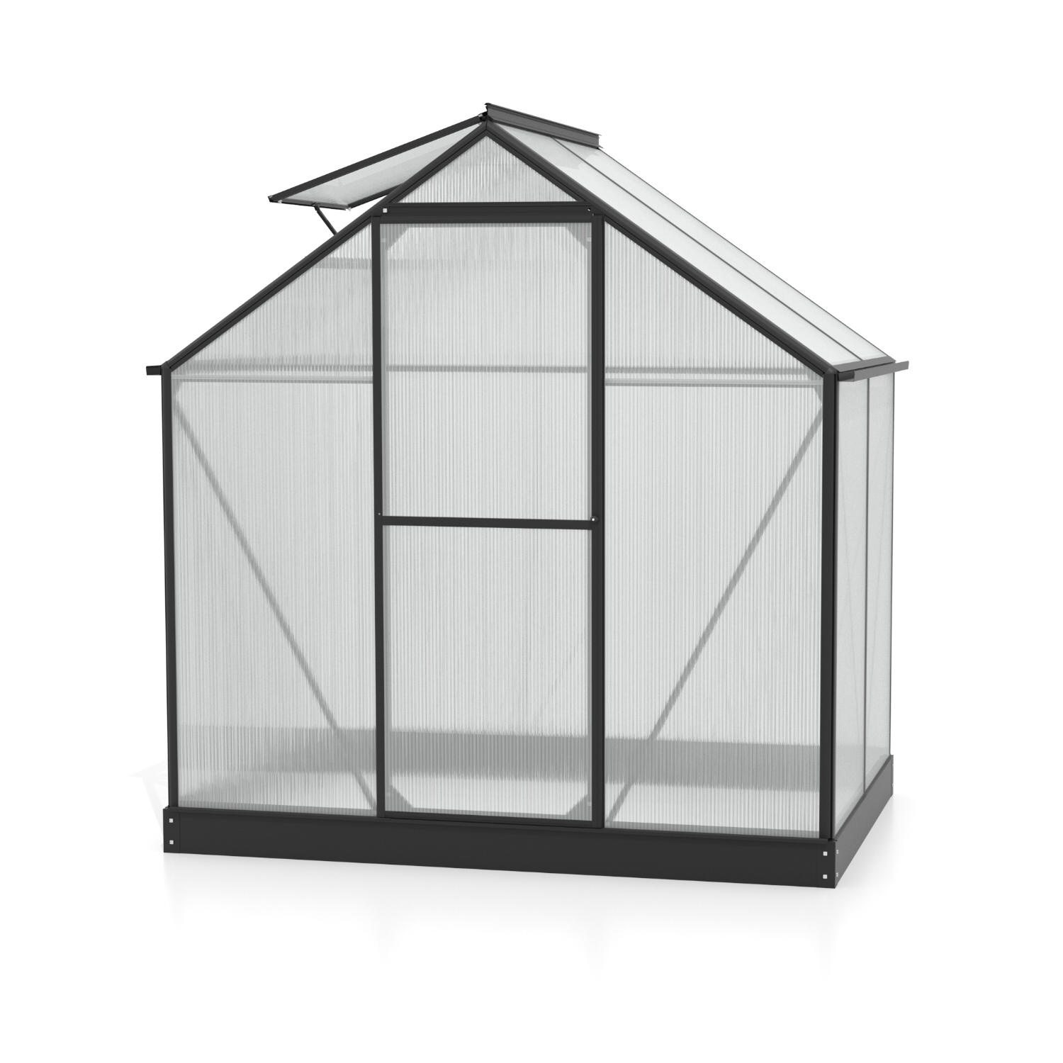 Szklarnia aluminiowa, sz 1,98 x gł 1,31 m, czarna, 1x okno dachowe, poliwęglan o grubości 4 mm z Wielkiej Brytanii, drzwi uchylne, pow 2,59 m2.