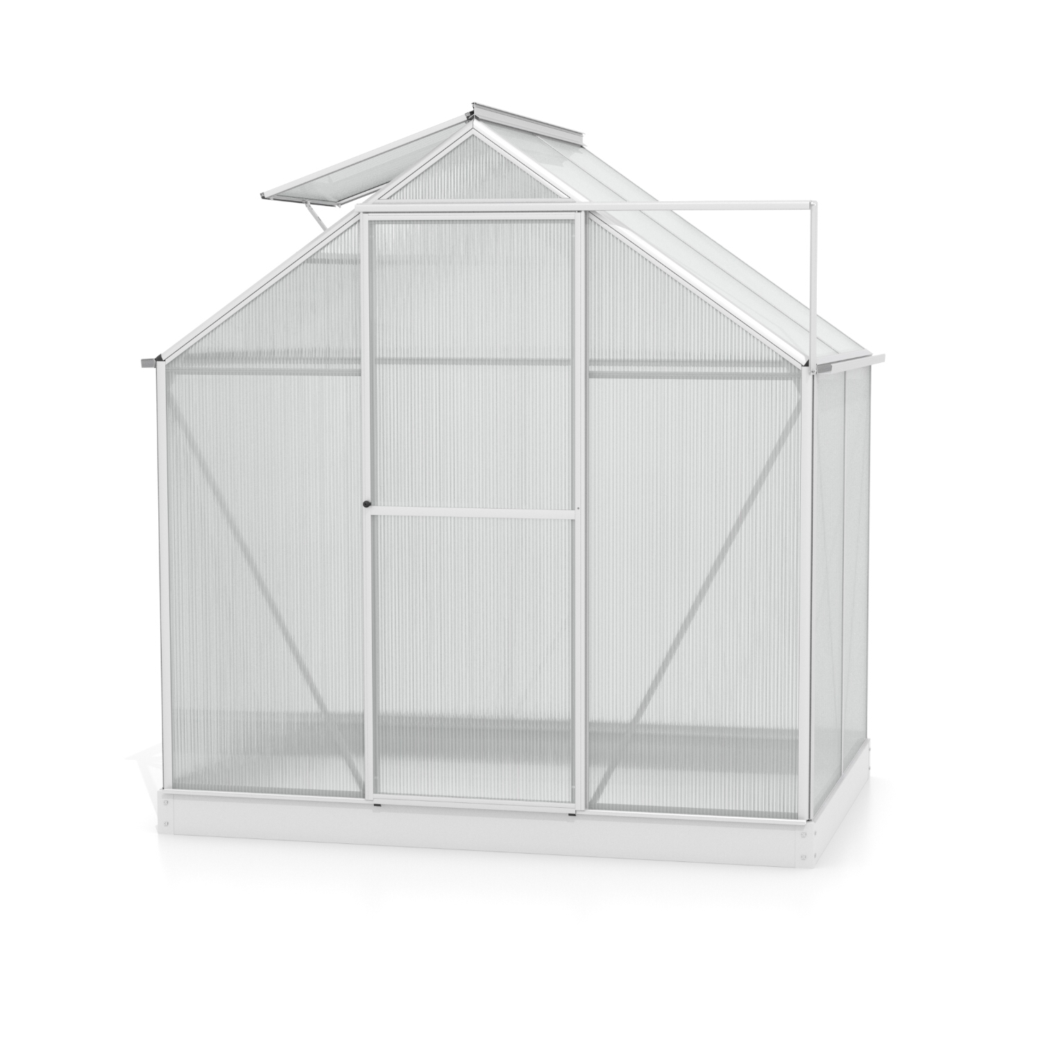 Pakiet zawiera drzwi jednoskrzydłowe na zawiasach (sz x w 0,61 x 1,64 m), profile AL, przeszklenie, podstawa ze stali ocynkowanej, 1x okno dachowe wentylacyjne otwierane ręcznie, wszystkie elementy mocujące. Istnieje możliwość zakupu szeregu niestandardowych akcesoriów do szklarni - półki, stojaki, dodatkowa wentylacja okien dachowych i bocznych, automatyczne otwieracze do tych okien, zestawy rynnowe, termometry, higrometry.