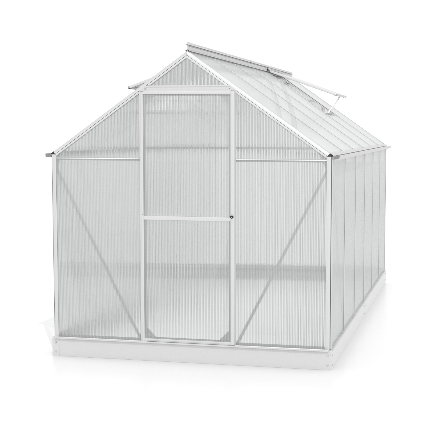 Szklarnia aluminiowa, sz 1,98 x gł 3,79 m, kolor srebrny, 2x okno dachowe, poliwęglan o grubości 6 mm z Wielkiej Brytanii, drzwi uchylne, pow 7,50 m2.