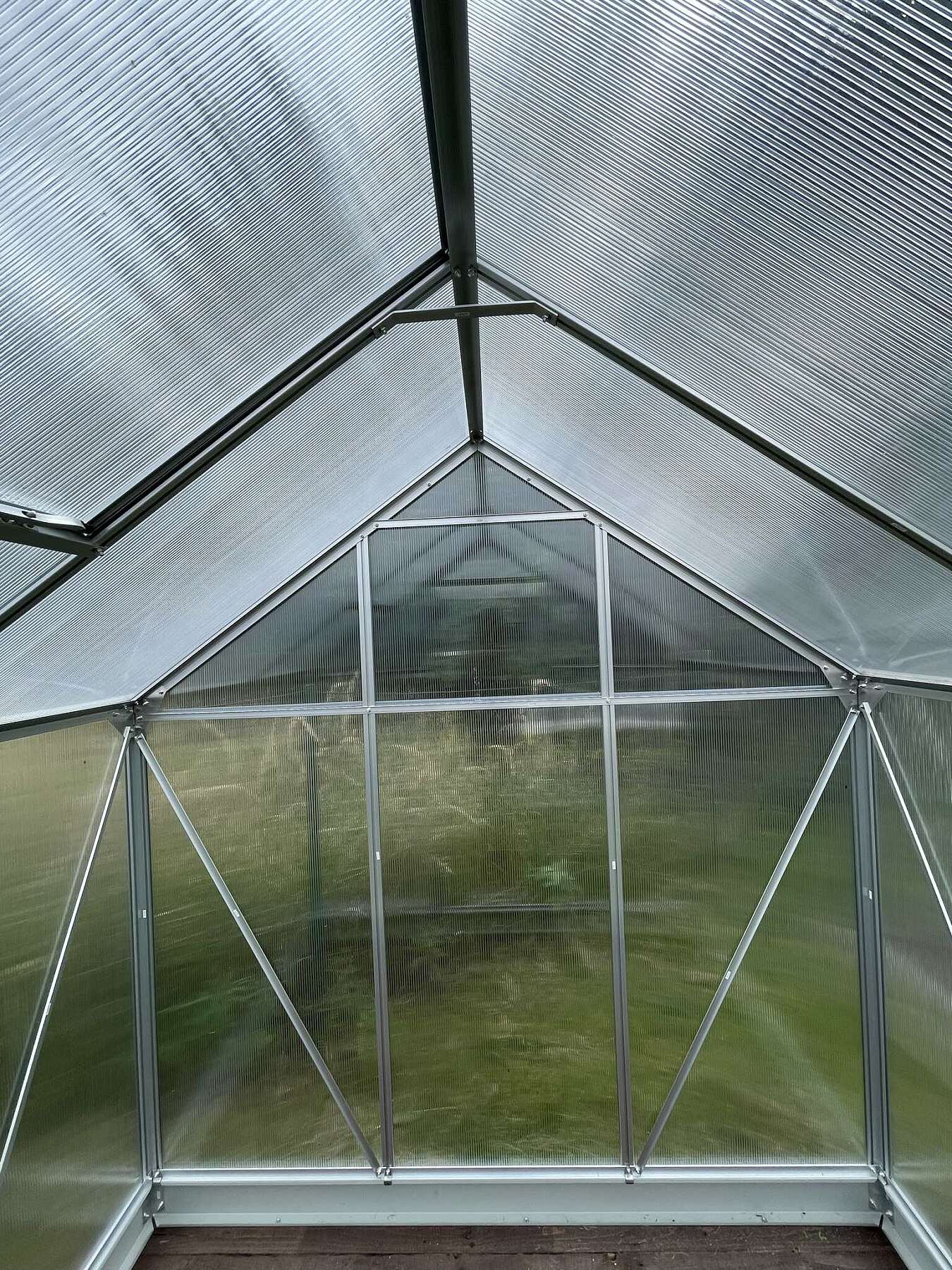 Szklarnia aluminiowa, sz 1,98 x gł 3,79 m, kolor zielony, 2x okno dachowe, poliwęglan o grubości 6 mm z Wielkiej Brytanii, drzwi uchylne, pow 7,50 m2.