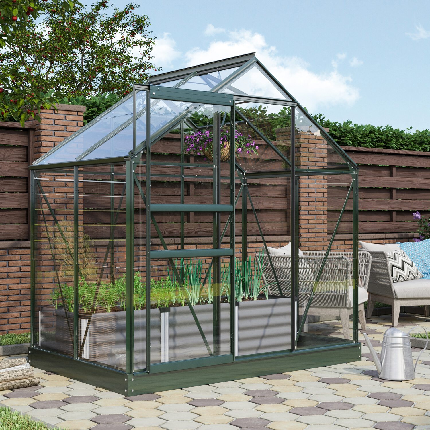 Szklarnia aluminiowa, sz 1,95 x gł 1,31 m, kolor zielony, 1x okno dachowe, szkło hartowane przezroczyste 3 mm, pow 2,55 m2.