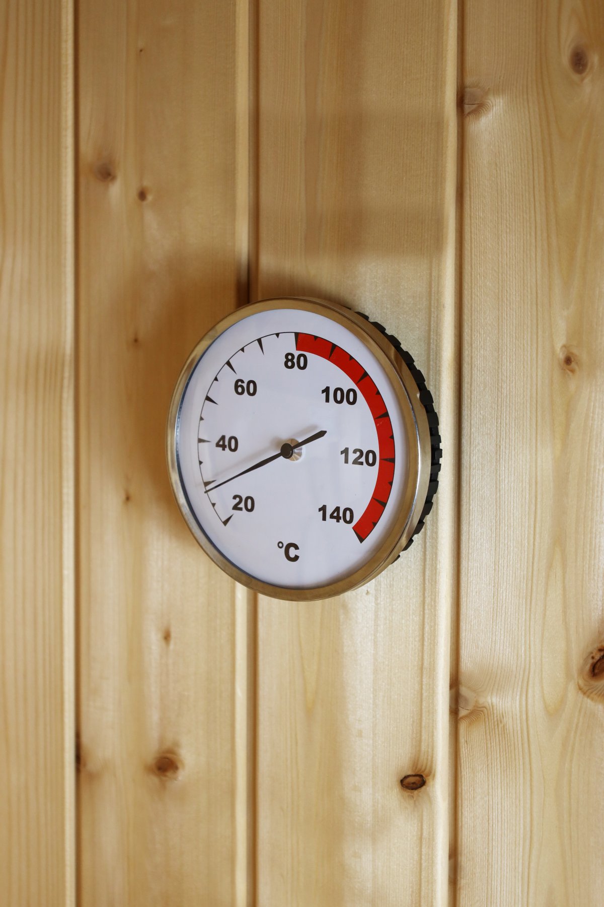 Klasyczny termometr do sauny niezawodnie wskazuje aktualną temperaturę podczas korzystania z sauny. Pozwala to na łatwe monitorowanie warunków panujących w saunie i dostosowanie klimatu do własnych upodobań. Urządzenie ma średnicę 10 cm i jest umieszczone w metalowej obudowie z elegancką chromowaną ramką. Zakres temperatur wynosi od 0 do 120°C. Kolorowy obszar na skali wskazuje idealną temperaturę do sauny. Zapewnij sobie komfortowy i bezpieczny pobyt w saunie z tym klasycznym termometrem.